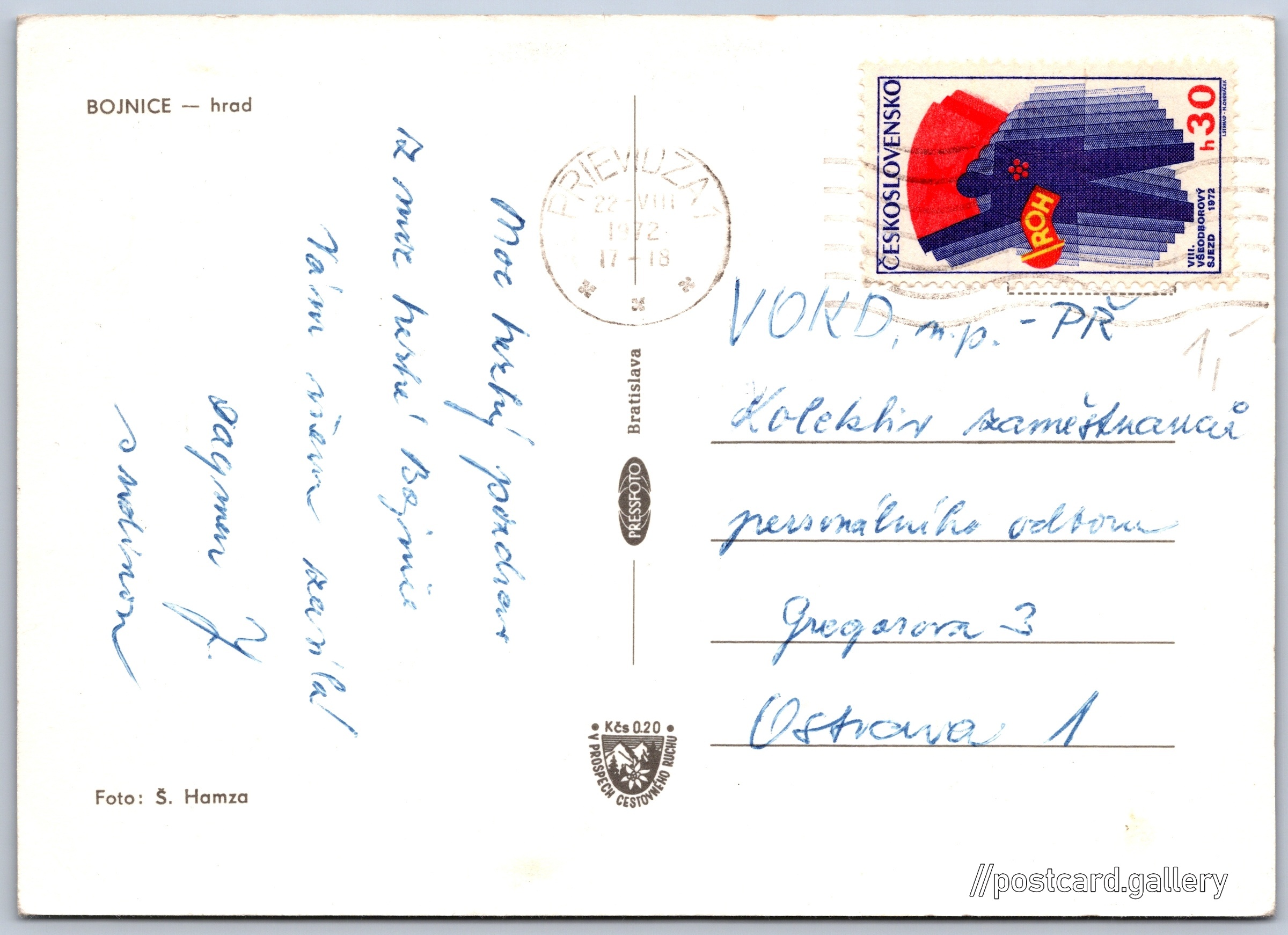 Bojnice, hrad 6/24 Pokud chcete vidět pohlednice ve vyšším rozlišení nebo zobrazovat jejich zadní stranu, tak se prosím nejdříve přihlašte Přihlásit Zaregistrovat BOJNICE - hrad Jazyk tištěného textu na pohlednici: slovenština Zámok a okolie ukázat na mapě V blízkém okolí místa zobrazeného na pohlednici lze najít 24 jiných pohlednic. Zobrazit blízké pohlednice Vydavatel: PressFoto Bratislava (Československo) Odhadované datum vydání pohlednice: 1969 - 1972 Pomozte nám zpřesnit rok vzniku pohlednice Velikost (š x v) a tvar pohlednice: 147 x 105 mm (5.79" x 4.13"), obdélník Osoby spjaté s touto pohlednicí: Štefan Hamza(Autor fotografie) Prošlá poštou:Datum na razítku: 22.8.1972 Ceny: Příplatek na tur. ruch: 0,20 Kčs (CSK))Vyplacené známky: 0,30 Kčs (CSK) DiskuseVložit příspěvek Přidat novou složku ... Spravovat složky ...