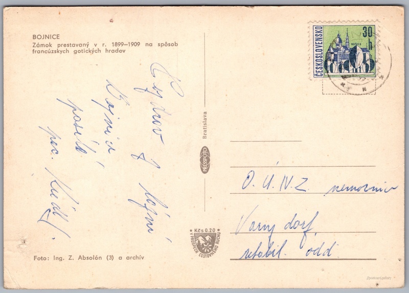 Bojnice, zámek Pokud chcete vidět pohlednice ve vyšším rozlišení nebo zobrazovat jejich zadní stranu, tak se prosím nejdříve přihlašte Přihlásit Zaregistrovat BOJNICEZámok prestavaný v r. 1899-1909 na spôsob francúzskych gotických hradov Jazyk tištěného textu na pohlednici: slovenština Bojnický zámek, Zámek, Zámok a okolie 1/1, Bojnice, Slovensko ukázat na mapě V blízkém okolí místa zobrazeného na pohlednici lze najít 24 jiných pohlednic. Zobrazit blízké pohlednice Vydavatel: PressFoto Bratislava (Československo) Datum vydání není známo Pomozte nám odhadnout datum vzniku pohlednice Velikost (š x v) a tvar pohlednice: 149 x 105 mm (5.87" x 4.13"), obdélník Osoby spjaté s touto pohlednicí: Zoltán Absolon(Autor fotografie) Prošlá poštou Ceny: Příplatek na tur. ruch: 0,20 Kčs (CSK))Vyplacené známky: 0,30 Kčs (CSK) DiskuseVložit příspěvek Přidat novou složku ... Spravovat složky ...