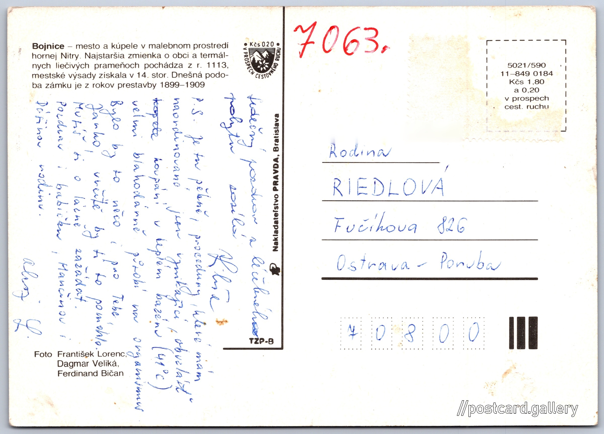 Bojnice Pokud chcete vidět pohlednice ve vyšším rozlišení nebo zobrazovat jejich zadní stranu, tak se prosím nejdříve přihlašte Přihlásit Zaregistrovat Bojnice Bojnice - mesto a kúpele v malebnom prostredí hornej Nitry. Najstaršia zmienka o obci a termálnych liečivých prameňoch pochádza z r. 1113, mestské výsady získala v 14. stor. Dnešná podoba zámku je z rokov prestavby 1899-1909 Jazyk tištěného textu na pohlednici: slovenština Bojnický zámek, Zámek, Zámok a okolie 1/1, Bojnice, Slovensko ukázat na mapě Vydavatel: Nakladateľstvo PRAVDA, Bratislava (Československo) Rok vydání pohlednice: leden, 1984 Velikost (š x v) a tvar pohlednice: 147 x 106 mm (5.79" x 4.17"), obdélník Osoby spjaté s touto pohlednicí: František Lorenc(Autor fotografie) Dagmar Veliká(Autor fotografie) Ferdinand Bičan(Autor fotografie) Prošlá poštou Ceny: Cena pohlednice: 1,80 Kčs (CSK) (+0,20 Kčs přípl. na tur. ruch) Kódy na pohlednici: 5021/590 11-849 0184 DiskuseVložit příspěvek Přidat novou složku ... Spravovat složky ...
