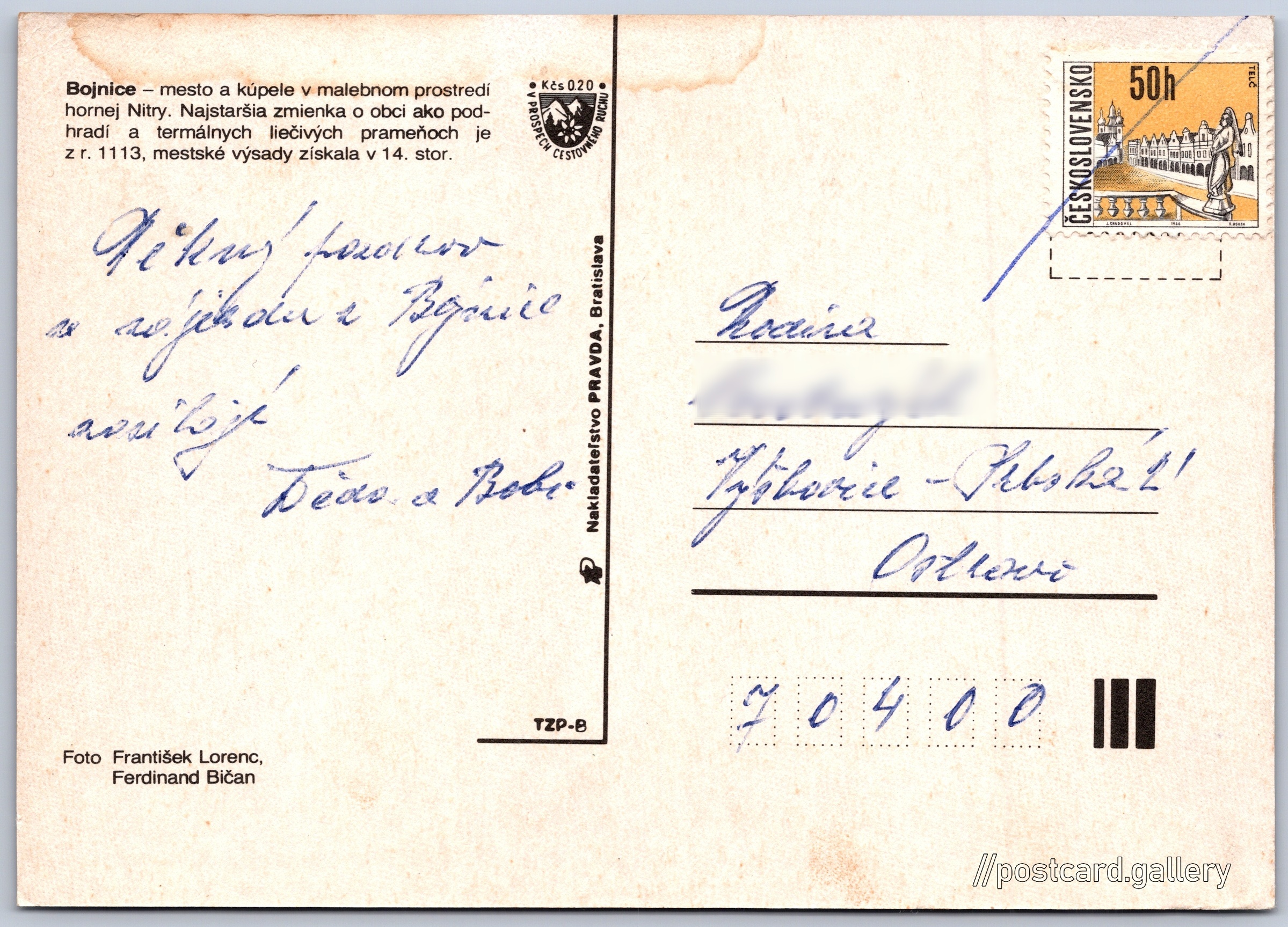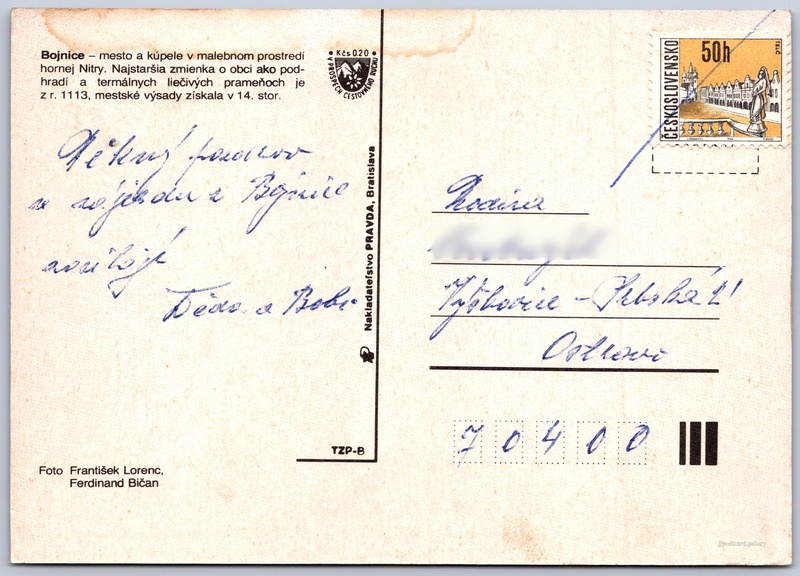 Bojnice Pokud chcete vidět pohlednice ve vyšším rozlišení nebo zobrazovat jejich zadní stranu, tak se prosím nejdříve přihlašte Přihlásit Zaregistrovat Bojnice Bojnice - mesto a kúpele v malebnom prostredí hornej Nitry. Najstaršia zmienka o obci ako podhradí a termálnych liečivých prameňoch je z r. 1113, mestské výsady získala v 14. stor. Jazyk tištěného textu na pohlednici: slovenština Bojnický zámek, Zámek, Zámok a okolie 1/1, Bojnice, Slovensko ukázat na mapě Vydavatel: Nakladateľstvo PRAVDA, Bratislava (Československo) Datum vydání není známo Pomozte nám odhadnout datum vzniku pohlednice Velikost (š x v) a tvar pohlednice: 146 x 105 mm (5.75" x 4.13"), obdélník Osoby spjaté s touto pohlednicí: František Lorenc(Autor fotografie) Ferdinand Bičan(Autor fotografie) Prošlá poštou Ceny: Příplatek na tur. ruch: 0,20 Kčs (CSK))Vyplacené známky: 0,50 Kčs (CSK) DiskuseVložit příspěvek Přidat novou složku ... Spravovat složky ...