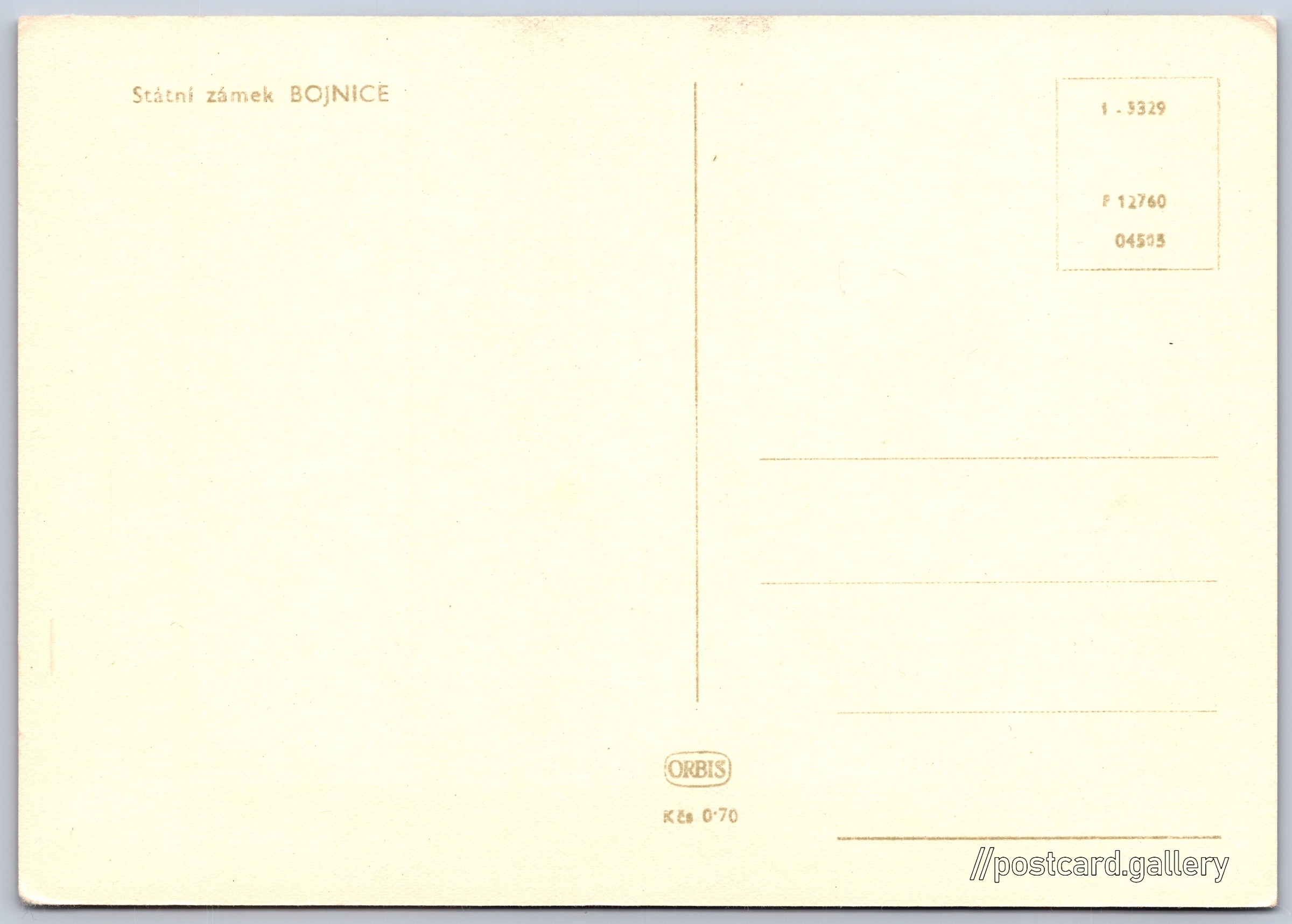 Bojnický zámek Pokud chcete vidět pohlednice ve vyšším rozlišení nebo zobrazovat jejich zadní stranu, tak se prosím nejdříve přihlašte Přihlásit Zaregistrovat Státní zámek BOJNICE Jazyk tištěného textu na pohlednici: čeština Bojnice ukázat na mapě V blízkém okolí místa zobrazeného na pohlednici lze najít 24 jiných pohlednic. Zobrazit blízké pohlednice Vydavatel: Nakladatelství Orbis (Československo) Datum vydání není známo Pomozte nám odhadnout datum vzniku pohlednice Velikost (š x v) a tvar pohlednice: 147 x 104 mm (5.79" x 4.09"), obdélník Čistá pohlednice (neprošlá poštou) Ceny: Cena pohlednice: 0,70 Kčs (CSK) Kódy na pohlednici: 1-3329 F 12760 04503 DiskuseVložit příspěvek Přidat novou složku ... Spravovat složky ...