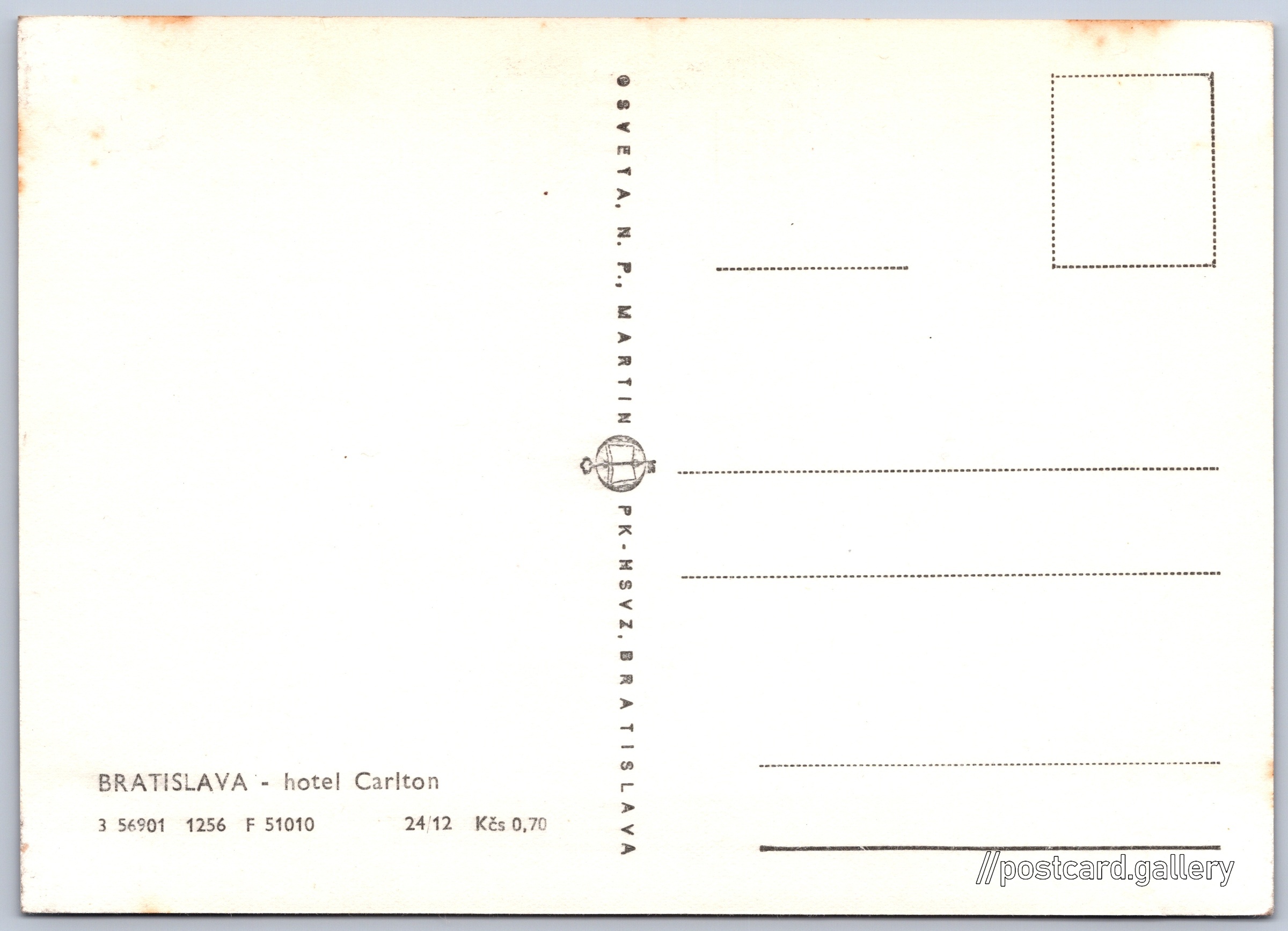 Bratislava, hotel Carlton Pokud chcete vidět pohlednice ve vyšším rozlišení nebo zobrazovat jejich zadní stranu, tak se prosím nejdříve přihlašte Přihlásit Zaregistrovat BRATISLAVA - hotel Carlton Jazyk tištěného textu na pohlednici: slovenština Hotel Carlton, Hviezdoslavovo namestie 3, Bratislava - Staré Mesto, Slovensko ukázat na mapě V blízkém okolí místa zobrazeného na pohlednici lze najít 43 jiných pohlednic. Zobrazit blízké pohlednice Vydavatel: Osveta, n. p., Martin PŠK - Bratislava (Československo) Rok vydání pohlednice: prosinec, 1956 Velikost (š x v) a tvar pohlednice: 146 x 105 mm (5.75" x 4.13"), obdélník Čistá pohlednice (neprošlá poštou) Ceny: Cena pohlednice: 0,70 Kčs (CSK) Kódy na pohlednici: 3 56901 1256 F 51010 24/12 DiskuseVložit příspěvek Přidat novou složku ... Spravovat složky ...