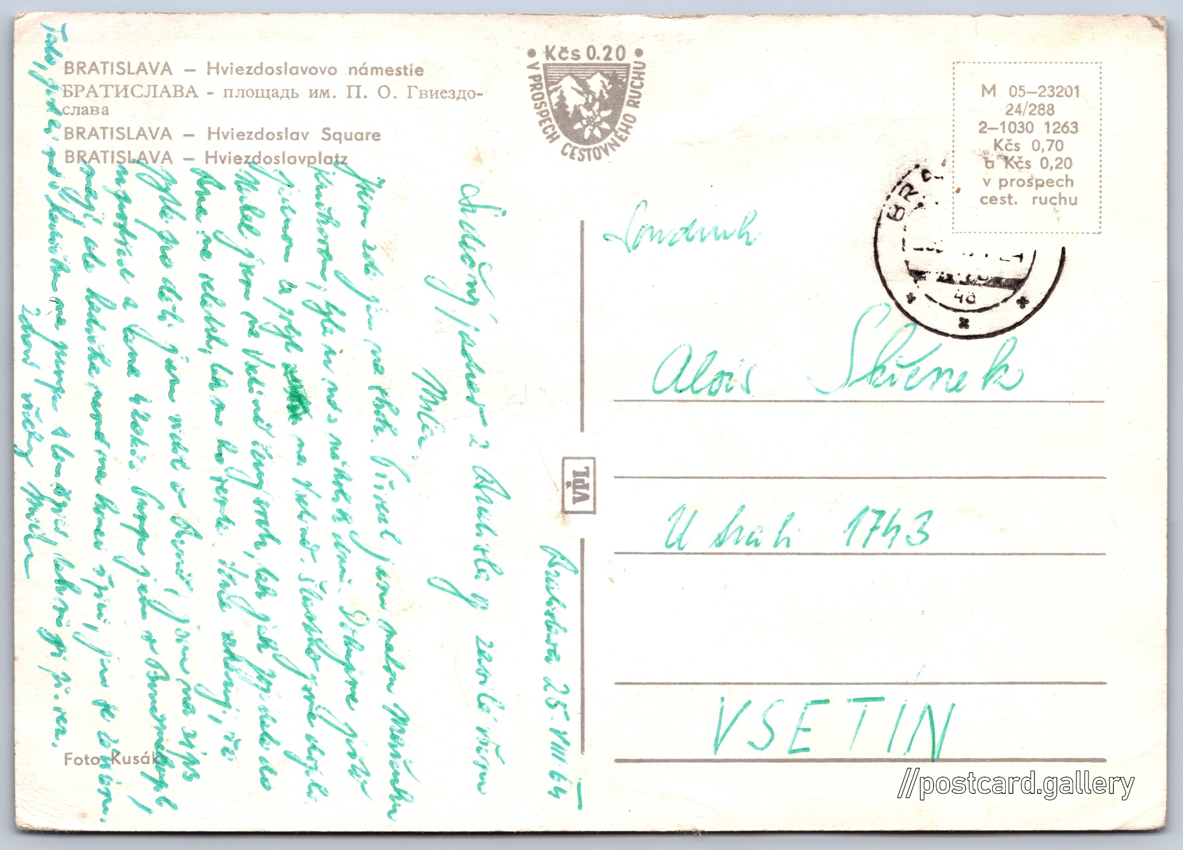 Bratislava, Hviezdoslavovo náměstí 9/43 Pokud chcete vidět pohlednice ve vyšším rozlišení nebo zobrazovat jejich zadní stranu, tak se prosím nejdříve přihlašte Přihlásit Zaregistrovat - BRATISLAVA - Hviezdoslavovo námestie- БРАТИСЛАВА - площадь им. П. О. Гвиездослава- BRATISLAVA - Hviezdoslav Square- BRATISLAVA - Hviezdoslavplatz Jazyk tištěného textu na pohlednici: slovenština Hviezdoslavovo náměstí, Ulice, Bratislava, Slovensko ukázat na mapě V blízkém okolí místa zobrazeného na pohlednici lze najít 43 jiných pohlednic. Zobrazit blízké pohlednice Vydavatel: VPL (Československo) Rok vydání pohlednice: prosinec, 1963 Velikost (š x v) a tvar pohlednice: 148 x 105 mm (5.83" x 4.13"), obdélník Osoby spjaté s touto pohlednicí: Dalibor Kusák(Autor fotografie) Prošlá poštou:Datum na razítku: 25.8.1964Datum napsání pohledu: 25.8.1964 Ceny: Cena pohlednice: 0,70 Kčs (CSK) (+0,20 Kčs přípl. na tur. ruch) Kódy na pohlednici: M 05-23201 24/288 2-1030 1263 DiskuseVložit příspěvek Přidat novou složku ... Spravovat složky ...