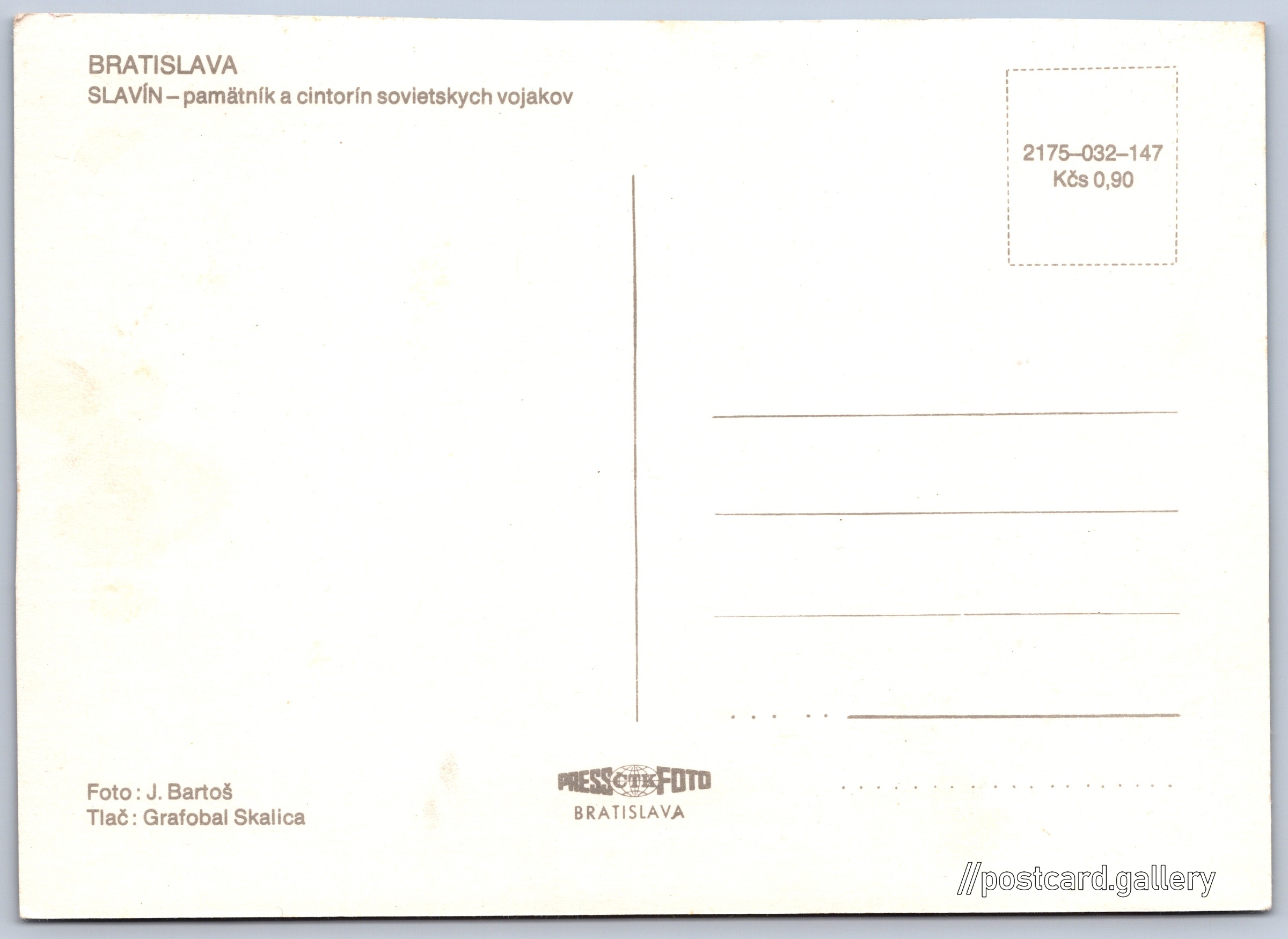 Bratislava, Slavín Pokud chcete vidět pohlednice ve vyšším rozlišení nebo zobrazovat jejich zadní stranu, tak se prosím nejdříve přihlašte Přihlásit Zaregistrovat BRATISLAVASLAVÍN - pamätník a cintorín sovietskych vojakov Jazyk tištěného textu na pohlednici: slovenština Slavín, Pomník, památník, Bratislava - Staré Mesto, Slovensko ukázat na mapě V blízkém okolí místa zobrazeného na pohlednici lze najít 43 jiných pohlednic. Zobrazit blízké pohlednice Vydavatel: PressFoto Bratislava (Československo) Datum vydání není známo Pomozte nám odhadnout datum vzniku pohlednice Velikost (š x v) a tvar pohlednice: 146 x 105 mm (5.75" x 4.13"), obdélník Osoby spjaté s touto pohlednicí: J. Bartoš(Autor fotografie) Čistá pohlednice (neprošlá poštou) Ceny: Cena pohlednice: 0,90 Kčs (CSK) (+0,20 Kčs přípl. na tur. ruch) Kódy na pohlednici: 2175-032-147 DiskuseVložit příspěvek Přidat novou složku ... Spravovat složky ...