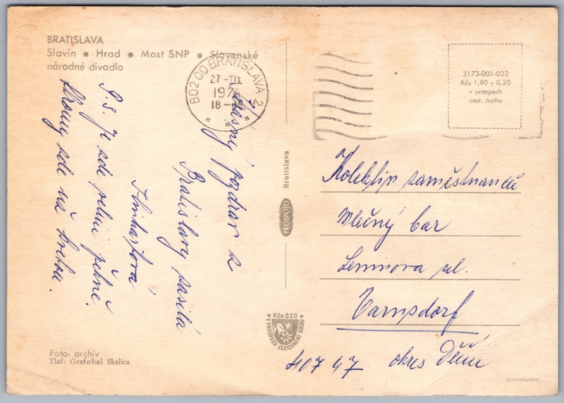 Bratislava 5/43 Pokud chcete vidět pohlednice ve vyšším rozlišení nebo zobrazovat jejich zadní stranu, tak se prosím nejdříve přihlašte Přihlásit Zaregistrovat BRATISLAVA- Slavín- Hrad- Most SNP- Slovenské národné divadlo Jazyk tištěného textu na pohlednici: slovenština Most Slovenského národního povstání, Ulice, Bratislava, Slovensko ukázat na mapě V blízkém okolí místa zobrazeného na pohlednici lze najít 43 jiných pohlednic. Zobrazit blízké pohlednice Vydavatel: PressFoto Bratislava (Československo) Odhadované datum vydání pohlednice: 1971 - 1974 Pomozte nám zpřesnit rok vzniku pohlednice Velikost (š x v) a tvar pohlednice: 148 x 105 mm (5.83" x 4.13"), obdélník Prošlá poštou:Datum na razítku: 27.3.1974 Ceny: Cena pohlednice: 1,80 Kčs (CSK) (+0,20 Kčs přípl. na tur. ruch) Kódy na pohlednici: 2173-001-032 DiskuseVložit příspěvek Přidat novou složku ... Spravovat složky ...