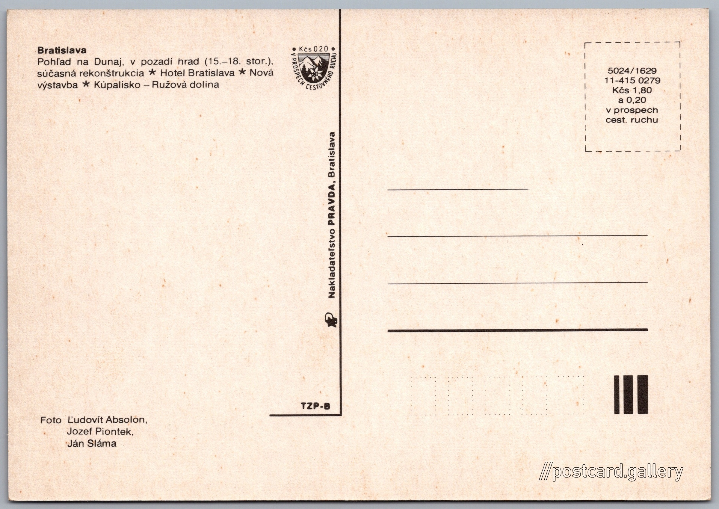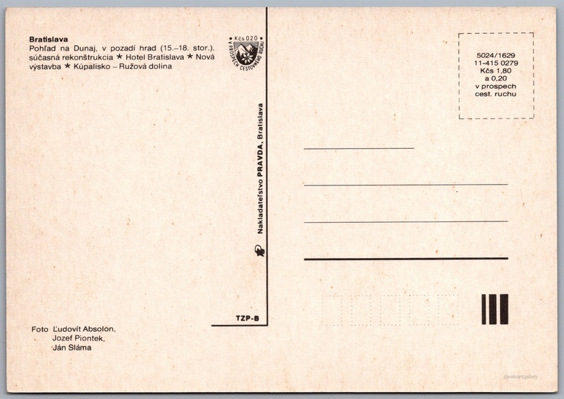 Bratislava 2/14 Pokud chcete vidět pohlednice ve vyšším rozlišení nebo zobrazovat jejich zadní stranu, tak se prosím nejdříve přihlašte Přihlásit Zaregistrovat Bratislava Bratislava- Pohľad na Dunaj, v pozadí hrad (15.-18. stor.), súčasná rekonštrukcia- Hotel Bratislava- Nová výstavba- Kúpalisko - Ružová dolina Jazyk tištěného textu na pohlednici: slovenština Bratislavský hrad, Hrad, Bratislava - Staré Mesto, Slovensko ukázat na mapě V blízkém okolí místa zobrazeného na pohlednici lze najít 43 jiných pohlednic. Zobrazit blízké pohlednice Vydavatel: Nakladateľstvo PRAVDA, Bratislava (Československo) Datum vydání není známo Pomozte nám odhadnout datum vzniku pohlednice Velikost (š x v) a tvar pohlednice: 148 x 103 mm (5.83" x 4.06"), obdélník Osoby spjaté s touto pohlednicí: Ľudovít Absolon(Autor fotografie) Ján Sláma(Autor fotografie) Josef Piontek(Autor fotografie) Čistá pohlednice (neprošlá poštou) Ceny: Cena pohlednice: 1,80 Kčs (CSK) (+0,20 Kčs přípl. na tur. ruch) Kódy na pohlednici: 11-415 0279 5024/1629 DiskuseVložit příspěvek Přidat novou složku ... Spravovat složky ...