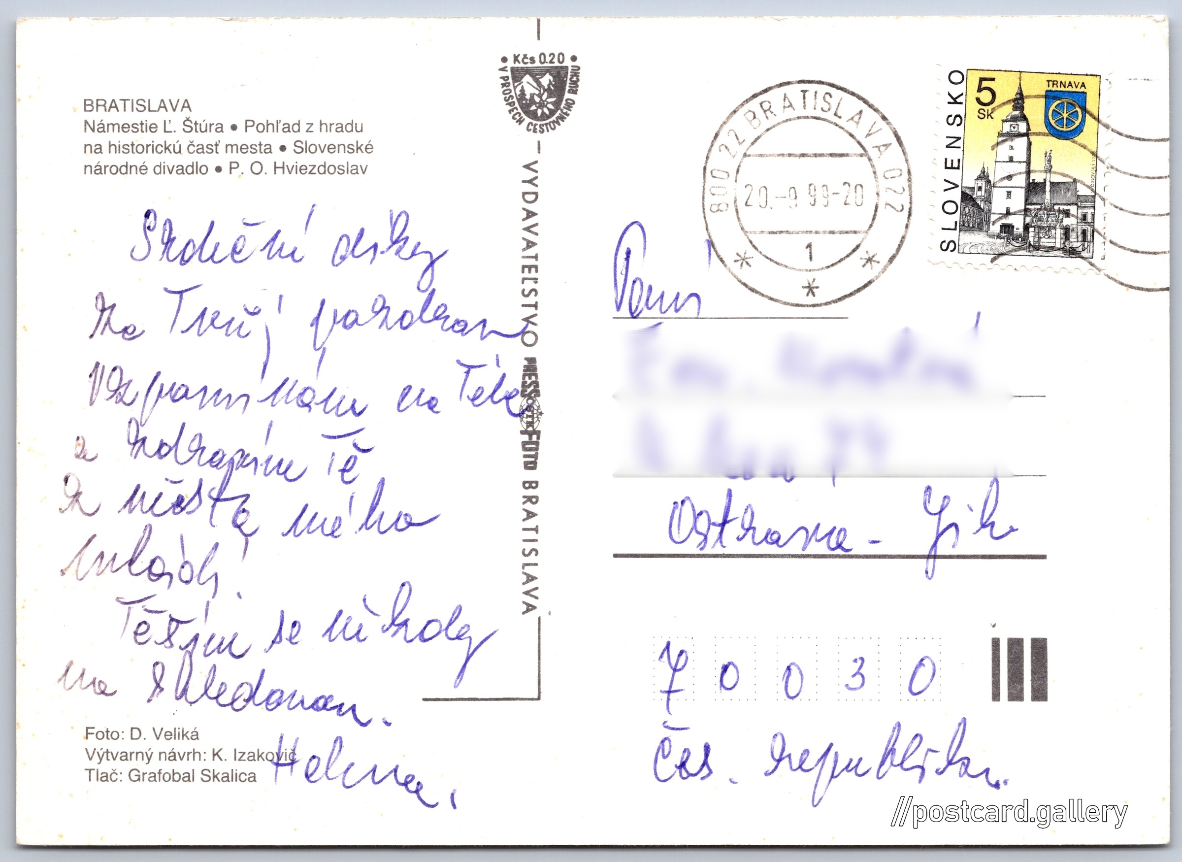 Bratislava Pokud chcete vidět pohlednice ve vyšším rozlišení nebo zobrazovat jejich zadní stranu, tak se prosím nejdříve přihlašte Přihlásit Zaregistrovat Bratislava BRATISLAVA- Námestie Ľ. Štúra- Pohľad z hradu na historickú časť mesta- Slovenské národné divadlo- P. O. Hviezdoslav Jazyk tištěného textu na pohlednici: slovenština Náměstí Ľudovíta Štúra ukázat na mapě Vydavatel: PressFoto Bratislava (Československo) Datum vydání není známo Pomozte nám odhadnout datum vzniku pohlednice Velikost (š x v) a tvar pohlednice: 146 x 105 mm (5.75" x 4.13"), obdélník Osoby spjaté s touto pohlednicí: Pavol Országh Hviezdoslav(Obsah pohlednice) Ľudovít Štúr(Jméno v názvu místa) K. Izakovič(Design pohlednice) Dagmar Veliká(Autor fotografie) Prošlá poštou:Datum na razítku: 20.9.1999 Ceny: Příplatek na tur. ruch: 0,20 Kčs (CSK))Vyplacené známky: 5,00 Sk (SKK) DiskuseVložit příspěvek Přidat novou složku ... Spravovat složky ...