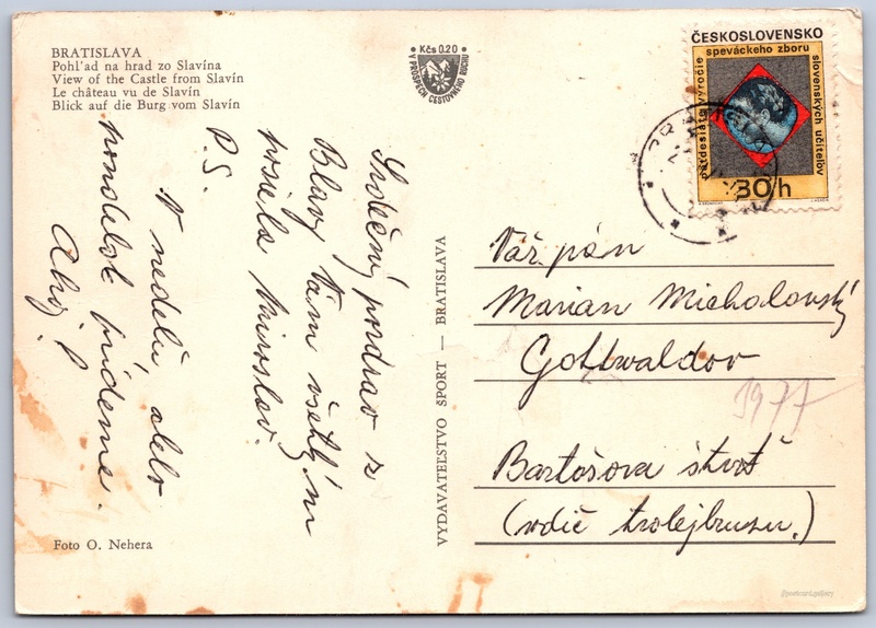 Bratislavský hrad Pokud chcete vidět pohlednice ve vyšším rozlišení nebo zobrazovat jejich zadní stranu, tak se prosím nejdříve přihlašte Přihlásit Zaregistrovat BRATISLAVAPohl'ad na hrad zo SlavínaView of the Castle from SlavínLe château vu de SlavínBlick auf die Burg vom Slavín Jazyk tištěného textu na pohlednici: slovenština Bratislavský hrad, Hrad, Bratislava - Staré Mesto, Slovensko ukázat na mapě V blízkém okolí místa zobrazeného na pohlednici lze najít 43 jiných pohlednic. Zobrazit blízké pohlednice Vydavatel: Vydavateľstvo Šport, Bratislava (Slovensko) Datum vydání není známo Pomozte nám odhadnout datum vzniku pohlednice Velikost (š x v) a tvar pohlednice: 148 x 105 mm (5.83" x 4.13"), obdélník Osoby spjaté s touto pohlednicí: Otakar Nehera(Autor fotografie) Prošlá poštou Ceny: Příplatek na tur. ruch: 0,20 Kčs (CSK))Vyplacené známky: 0,30 Kčs (CSK) DiskuseVložit příspěvek Přidat novou složku ... Spravovat složky ...