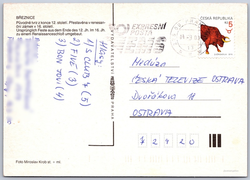 Březnice, zámek Pokud chcete vidět pohlednice ve vyšším rozlišení nebo zobrazovat jejich zadní stranu, tak se prosím nejdříve přihlašte Přihlásit Zaregistrovat BŘEZNICE- Původně tvrz z konce 12. století. Přestavěna v renesanční zámek v 16. století.- Ursprünglich Feste aus dem Ende des 12. Jh. Im 16. Jh. zu einem Renaissanceschloß umgebaut. Jazyky tištěného textu na pohlednici: čeština, němčina Zámek Březnice, Zámek, Zámecký obvod 24, Březnice, Středočeský kraj, Česko ukázat na mapě V blízkém okolí místa zobrazeného na pohlednici lze najít 1 jinou pohlednici. Zobrazit blízké pohlednice Vydavatel: PressFoto Praha (Československo) Odhadované datum vydání pohlednice: 1997 - 2000 Pomozte nám zpřesnit rok vzniku pohlednice Velikost (š x v) a tvar pohlednice: 147 x 105 mm (5.79" x 4.13"), obdélník Osoby spjaté s touto pohlednicí: Miroslav Krob ml.(Autor fotografie) Miroslav Krob(Autor fotografie) Prošlá poštou:Datum na razítku: 14.9.2000 Ceny: Vyplacené známky: 5,00 Kč (CZK) DiskuseVložit příspěvek Přidat novou složku ... Spravovat složky ...