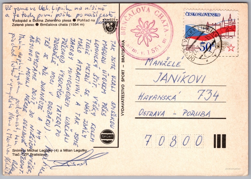 Brnčalova chata, Vysoké Tatry 2/2 Pokud chcete vidět pohlednice ve vyšším rozlišení nebo zobrazovat jejich zadní stranu, tak se prosím nejdříve přihlašte Přihlásit Zaregistrovat Brnčalova chata - Vodopád a Dolina Zeleného plesa- Pohľad na Zelené pleso- Brnčalova chata (1554 m) Jazyk tištěného textu na pohlednici: slovenština Zelené pleso Kežmarské, Vodní plocha, Vysoké Tatry - Tatranská Lomnica, Slovensko ukázat na mapě V blízkém okolí místa zobrazeného na pohlednici lze najít 118 jiných pohlednic. Zobrazit blízké pohlednice Vydavatel: Vydavateľstvo Šport, Bratislava (Slovensko) Odhadované datum vydání pohlednice: 1981 - 1984 Pomozte nám zpřesnit rok vzniku pohlednice Velikost (š x v) a tvar pohlednice: 147 x 104 mm (5.79" x 4.09"), obdélník Osoby spjaté s touto pohlednicí: Milan Legutky(Autor fotografie) Michal Legutky(Autor fotografie) Prošlá poštou:Datum na razítku: 24.7.1984 Ceny: Příplatek na tur. ruch: 0,20 Kčs (CSK))Vyplacené známky: 0,50 Kčs (CSK) DiskuseVložit příspěvek Přidat novou složku ... Spravovat složky ...