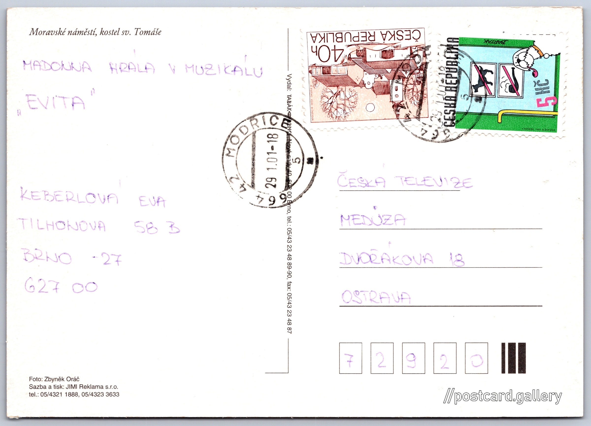 Brno, kostel sv. Tomáše Pokud chcete vidět pohlednice ve vyšším rozlišení nebo zobrazovat jejich zadní stranu, tak se prosím nejdříve přihlašte Přihlásit Zaregistrovat Brno Moravské náměstí, kostel sv. Tomáše Jazyk tištěného textu na pohlednici: čeština Kostel sv. Tomáše, Kostel, Moravské náměstí 1/1, Brno-město, Česko ukázat na mapě V blízkém okolí místa zobrazeného na pohlednici lze najít 39 jiných pohlednic. Zobrazit blízké pohlednice Vydavatel: Malý nakladatel (Česko) Odhadované datum vydání pohlednice: 1998 - 2001 Pomozte nám zpřesnit rok vzniku pohlednice Velikost (š x v) a tvar pohlednice: 148 x 105 mm (5.83" x 4.13"), obdélník Osoby spjaté s touto pohlednicí: Zbyněk Oráč(Autor fotografie) Prošlá poštou:Datum na razítku: 29.1.2001 Ceny: Vyplacené známky: 5,40 Kč (CZK) DiskuseVložit příspěvek Přidat novou složku ... Spravovat složky ...