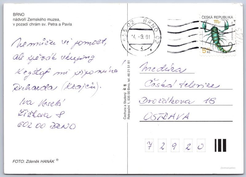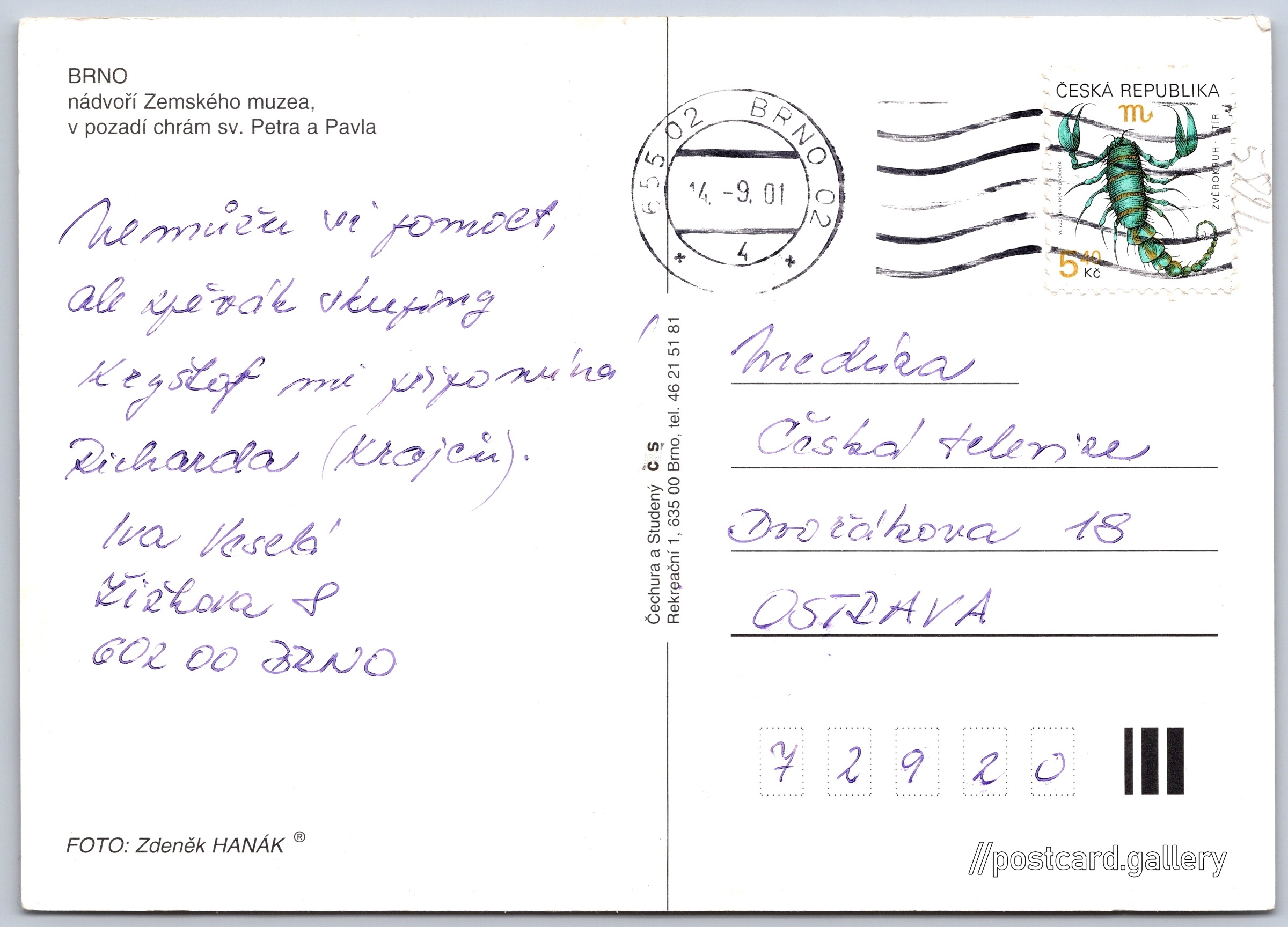 Brno, nádvoří Zemského muzea Pokud chcete vidět pohlednice ve vyšším rozlišení nebo zobrazovat jejich zadní stranu, tak se prosím nejdříve přihlašte Přihlásit Zaregistrovat BRNOnádvoří Zemského muzea, v pozadí chrám sv. Petra a Pavla Jazyk tištěného textu na pohlednici: čeština Brno-střed, Brno, Brno-město ukázat na mapě V blízkém okolí místa zobrazeného na pohlednici lze najít 39 jiných pohlednic. Zobrazit blízké pohlednice Vydavatel: Malý nakladatel (Česko) Odhadované datum vydání pohlednice: 1998 - 2001 Pomozte nám zpřesnit rok vzniku pohlednice Velikost (š x v) a tvar pohlednice: 148 x 106 mm (5.83" x 4.17"), obdélník Osoby spjaté s touto pohlednicí: Zdeněk Hanák(Autor fotografie) Prošlá poštou:Datum na razítku: 4.9.2001 Ceny: Vyplacené známky: 5,40 Kč (CZK) DiskuseVložit příspěvek Přidat novou složku ... Spravovat složky ...