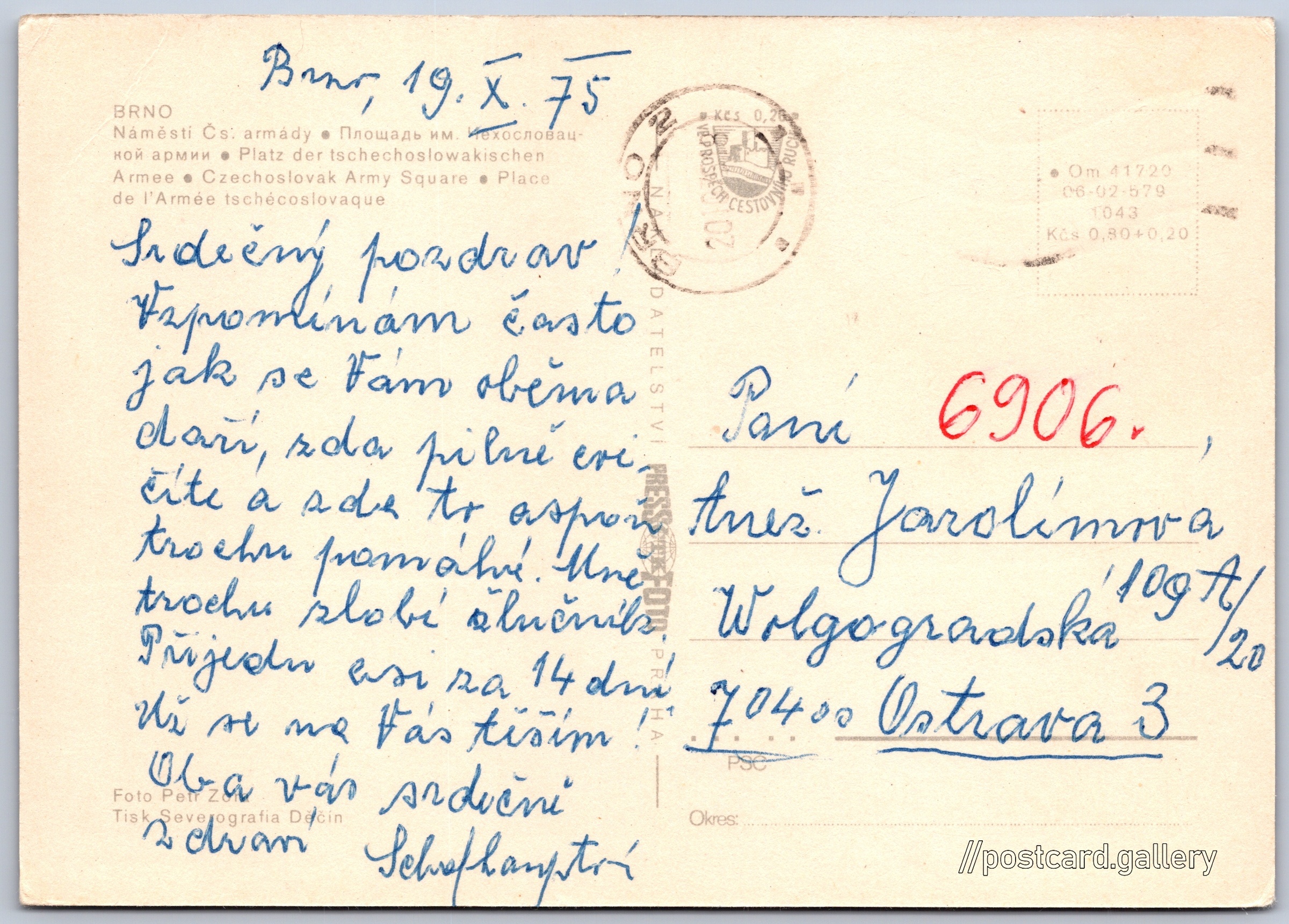 Brno, náměstí Čs. armády 10/39 Pokud chcete vidět pohlednice ve vyšším rozlišení nebo zobrazovat jejich zadní stranu, tak se prosím nejdříve přihlašte Přihlásit Zaregistrovat Brno BRNO- Námèsti Čs: armády- Площадь им ехословацной армии- Platz der tschechoslowakischen Armee- Czechoslovak Army Square- Place de l'Armée tschécoslovaque Jazyk tištěného textu na pohlednici: čeština Nádražní, Brno, Brno-město ukázat na mapě V blízkém okolí místa zobrazeného na pohlednici lze najít 39 jiných pohlednic. Zobrazit blízké pohlednice Vydavatel: PressFoto Praha (Československo) Rok vydání pohlednice: 1975 Velikost (š x v) a tvar pohlednice: 148 x 105 mm (5.83" x 4.13"), obdélník Osoby spjaté s touto pohlednicí: Petr Zora(Autor fotografie) Prošlá poštou:Datum napsání pohledu: 19.10.1975 Ceny: Cena pohlednice: 0,80 Kčs (CSK) (+0,20 Kčs přípl. na tur. ruch) Kódy na pohlednici: Om 41720 06-02-579 1043 DiskuseVložit příspěvek Přidat novou složku ... Spravovat složky ...