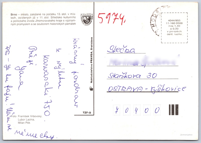 Brno Pokud chcete vidět pohlednice ve vyšším rozlišení nebo zobrazovat jejich zadní stranu, tak se prosím nejdříve přihlašte Přihlásit Zaregistrovat Brno Brno - město, založené na počátku 13. stol. v místech, osídlených již v 11. stol. Středisko kulturního a politického života Jihomoravského kraje s významným průmyslem a se souborem historických památek. Jazyk tištěného textu na pohlednici: čeština Mendlovo náměstí, Brno, Brno-město ukázat na mapě Vydavatel: Nakladateľstvo PRAVDA, Bratislava (Československo) Rok vydání pohlednice: květen, 1988 Velikost (š x v) a tvar pohlednice: 149 x 106 mm (5.87" x 4.17"), obdélník Osoby spjaté s touto pohlednicí: František Vrbovský(Autor fotografie) Lubor Lacina(Autor fotografie) Milan Pék(Autor fotografie) Prošlá poštou Ceny: Cena pohlednice: 1,40 Kčs (CSK) (+0,20 Kčs přípl. na tur. ruch) Kódy na pohlednici: 4044/955 11-160 0588 DiskuseVložit příspěvek Přidat novou složku ... Spravovat složky ...