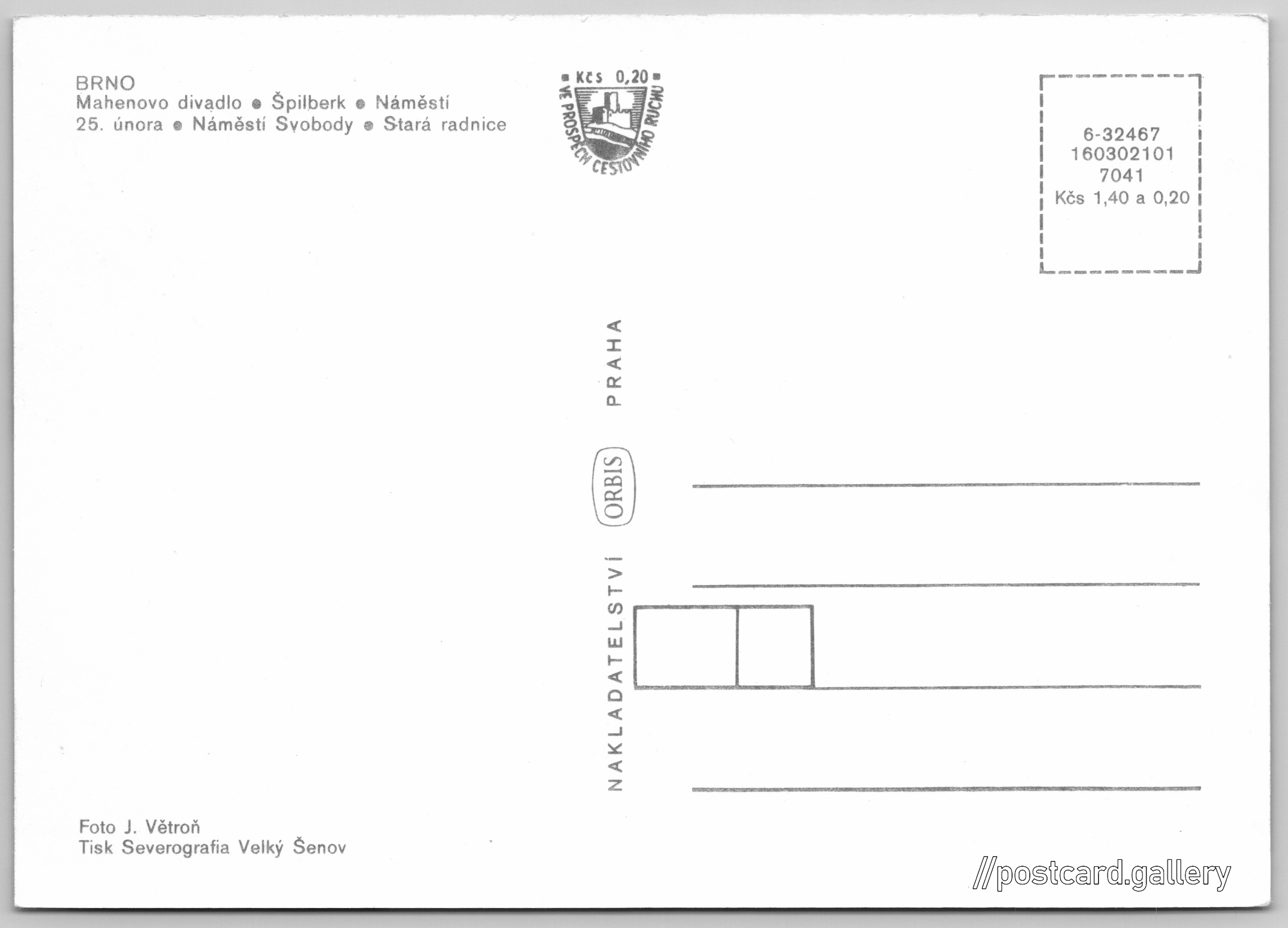Brno Pokud chcete vidět pohlednice ve vyšším rozlišení nebo zobrazovat jejich zadní stranu, tak se prosím nejdříve přihlašte Přihlásit Zaregistrovat Brno BRNO- Mahenovo divadlo- Špilberk- Náměstí 25. února- Náměstí Svobody- Stará radnice Jazyk tištěného textu na pohlednici: čeština Mahenovo divadlo, Malinovského náměstí 571/1, Brno-město, Česko ukázat na mapě V blízkém okolí místa zobrazeného na pohlednici lze najít 39 jiných pohlednic. Zobrazit blízké pohlednice Vydavatel: Nakladatelství Orbis (Československo) Datum vydání není známo Pomozte nám odhadnout datum vzniku pohlednice Velikost (š x v) a tvar pohlednice: 148 x 105 mm (5.83" x 4.13"), obdélník Osoby spjaté s touto pohlednicí: J. Větroň(Autor fotografie) Čistá pohlednice (neprošlá poštou) Ceny: Cena pohlednice: 1,40 Kčs (CSK) (+0,20 Kčs přípl. na tur. ruch) Kódy na pohlednici: 6-32467 160302101 7041 DiskuseVložit příspěvek Přidat novou složku ... Spravovat složky ...