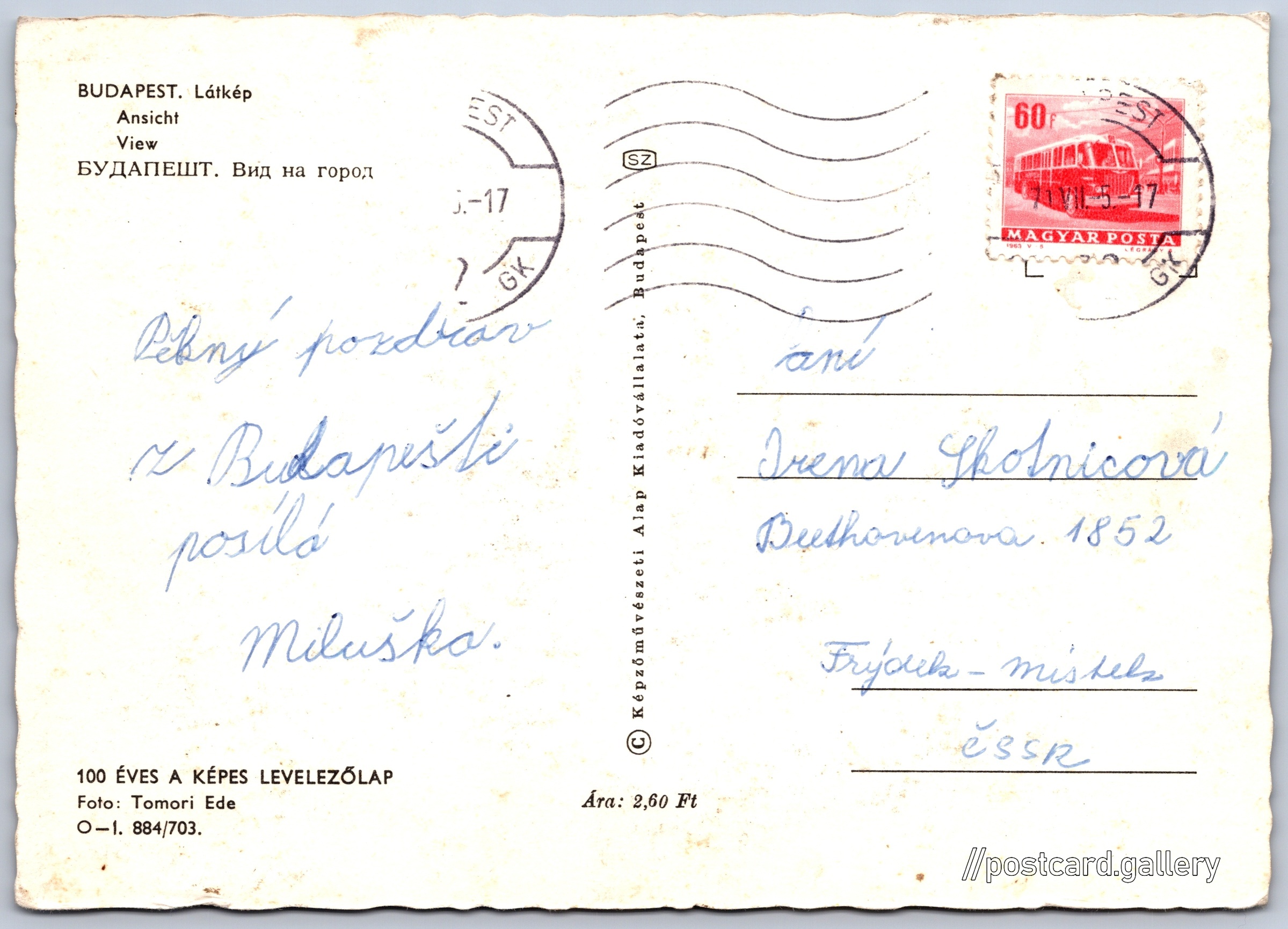 Budapešť, pohled na centrum města Pokud chcete vidět pohlednice ve vyšším rozlišení nebo zobrazovat jejich zadní stranu, tak se prosím nejdříve přihlašte Přihlásit Zaregistrovat BUDAPEST. LátképAnsichtViewБУДАПЕШТ. Вид на город100 ÉVES A KÉPES LEVELEZŐLAP Jazyk tištěného textu na pohlednici: maďarština I. obvod ukázat na mapě V blízkém okolí místa zobrazeného na pohlednici lze najít 1 jinou pohlednici. Zobrazit blízké pohlednice Vydavatel: Képzőművészeti Alap Kiadóvállalata (Maďarsko) Datum vydání není známo Pomozte nám odhadnout datum vzniku pohlednice Velikost (š x v) a tvar pohlednice: 148 x 105 mm (5.83" x 4.13"), obdélník, zoubkovaný Osoby spjaté s touto pohlednicí: Ede Tomori(Autor fotografie) Prošlá poštou Ceny: Cena pohlednice: 2 Ft (HUF)Vyplacené známky: 0 Ft (HUF) Kódy na pohlednici: O-I. 884/703 DiskuseVložit příspěvek Přidat novou složku ... Spravovat složky ...