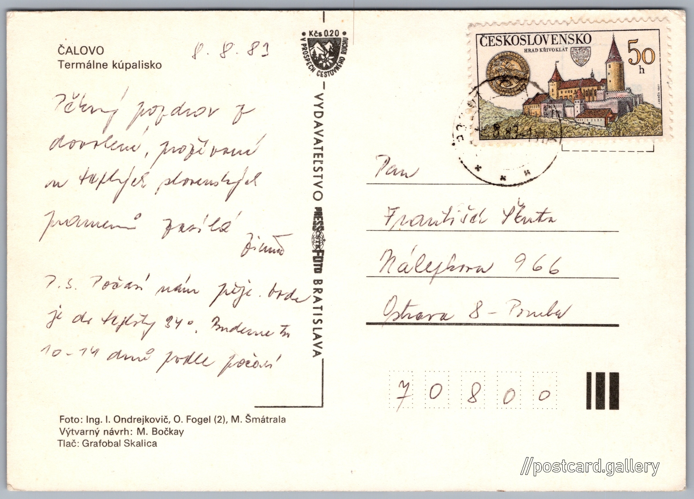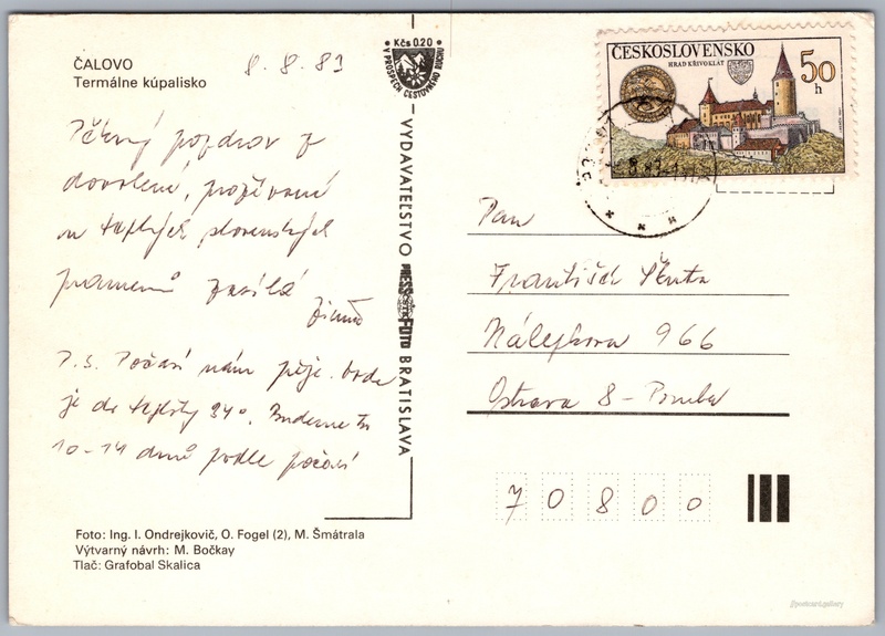 Čalovo, termálne kúpalisko Pokud chcete vidět pohlednice ve vyšším rozlišení nebo zobrazovat jejich zadní stranu, tak se prosím nejdříve přihlašte Přihlásit Zaregistrovat Termálne kúpalisko Čalovo ČALOVOTermálne kúpalisko Jazyk tištěného textu na pohlednici: slovenština Thermal spa, Promenádna 3685, Veľký Meder, Slovensko ukázat na mapě Vydavatel: PressFoto Bratislava (Československo) Odhadované datum vydání pohlednice: 1980 - 1983 Pomozte nám zpřesnit rok vzniku pohlednice Velikost (š x v) a tvar pohlednice: 149 x 105 mm (5.87" x 4.13"), obdélník Osoby spjaté s touto pohlednicí: Milan Šmátrala(Autor fotografie) Ivan Ondrejkovič(Autor fotografie) O. Fogel(Autor fotografie) M. Bočkay(Design pohlednice) Prošlá poštou:Datum na razítku: 8.8.1983Datum napsání pohledu: 8.8.1983 Ceny: Příplatek na tur. ruch: 0,20 Kčs (CSK))Vyplacené známky: 0,50 Kčs (CSK) DiskuseVložit příspěvek Přidat novou složku ... Spravovat složky ...