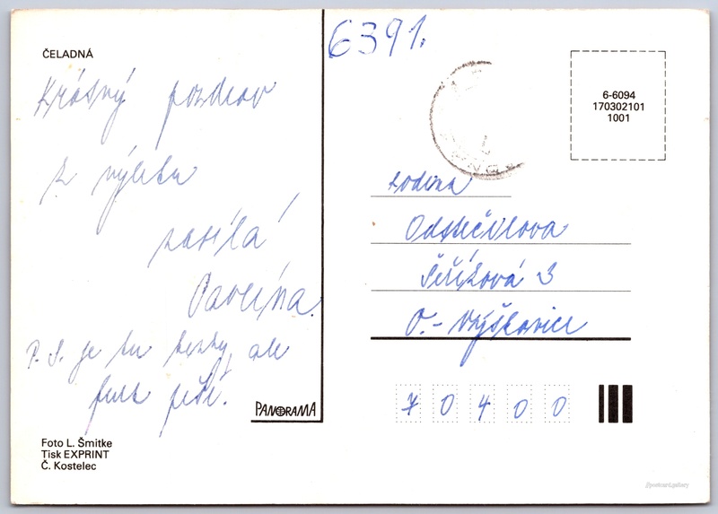 Čeladná Pokud chcete vidět pohlednice ve vyšším rozlišení nebo zobrazovat jejich zadní stranu, tak se prosím nejdříve přihlašte Přihlásit Zaregistrovat Čeladná ČELADNÁ Jazyk tištěného textu na pohlednici: čeština Čeladná, Obec, Česko ukázat na mapě V blízkém okolí místa zobrazeného na pohlednici lze najít 16 jiných pohlednic. Zobrazit blízké pohlednice Vydavatel: Panorama (Československo) Datum vydání není známo Pomozte nám odhadnout datum vzniku pohlednice Velikost (š x v) a tvar pohlednice: 148 x 105 mm (5.83" x 4.13"), obdélník Osoby spjaté s touto pohlednicí: L. Šmitke(Autor fotografie) Prošlá poštou Kódy na pohlednici: 6-6094 170302101 1001 DiskuseVložit příspěvek Přidat novou složku ... Spravovat složky ...