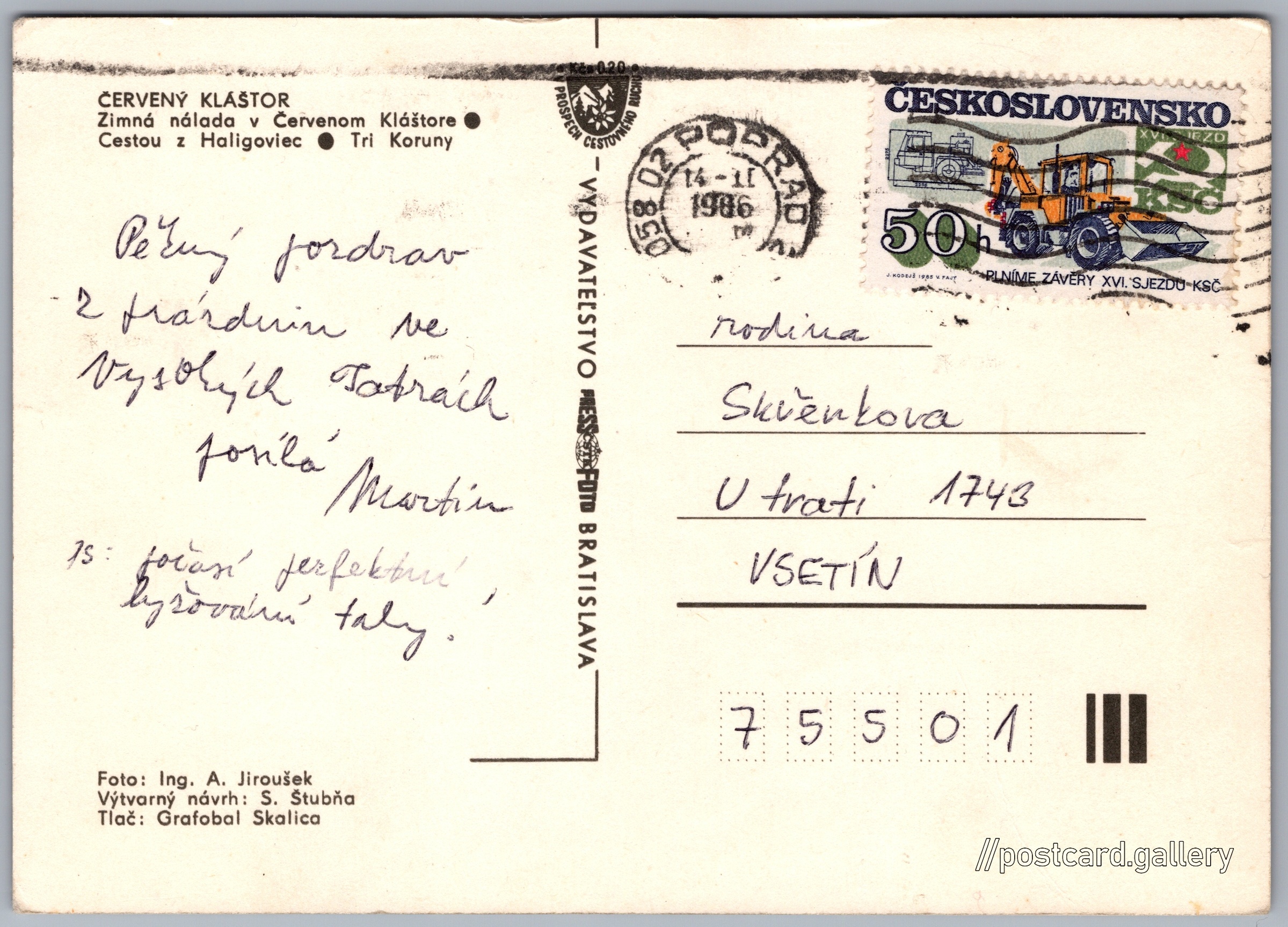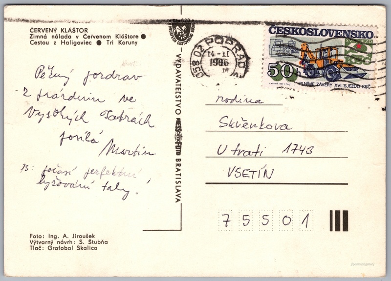Červený Kláštor Pokud chcete vidět pohlednice ve vyšším rozlišení nebo zobrazovat jejich zadní stranu, tak se prosím nejdříve přihlašte Přihlásit Zaregistrovat ČERVENÝ KLÁŠTOR- Zimná nálada v Červenom Kláštore- Cestou z Haligoviec- Tri Koruny Jazyk tištěného textu na pohlednici: slovenština Červený Kláštor, Vesnice, Slovensko ukázat na mapě V blízkém okolí místa zobrazeného na pohlednici lze najít 7 jiných pohlednic. Zobrazit blízké pohlednice Vydavatel: PressFoto Bratislava (Československo) Odhadované datum vydání pohlednice: 1983 - 1986 Pomozte nám zpřesnit rok vzniku pohlednice Velikost (š x v) a tvar pohlednice: 148 x 106 mm (5.83" x 4.17"), obdélník Osoby spjaté s touto pohlednicí: S. Štubňa(Design pohlednice) Alexander Jiroušek(Autor fotografie) Prošlá poštou:Datum na razítku: 14.11.1986 Ceny: Příplatek na tur. ruch: 0,20 Kčs (CSK))Vyplacené známky: 0,50 Kčs (CSK) DiskuseVložit příspěvek Přidat novou složku ... Spravovat složky ...