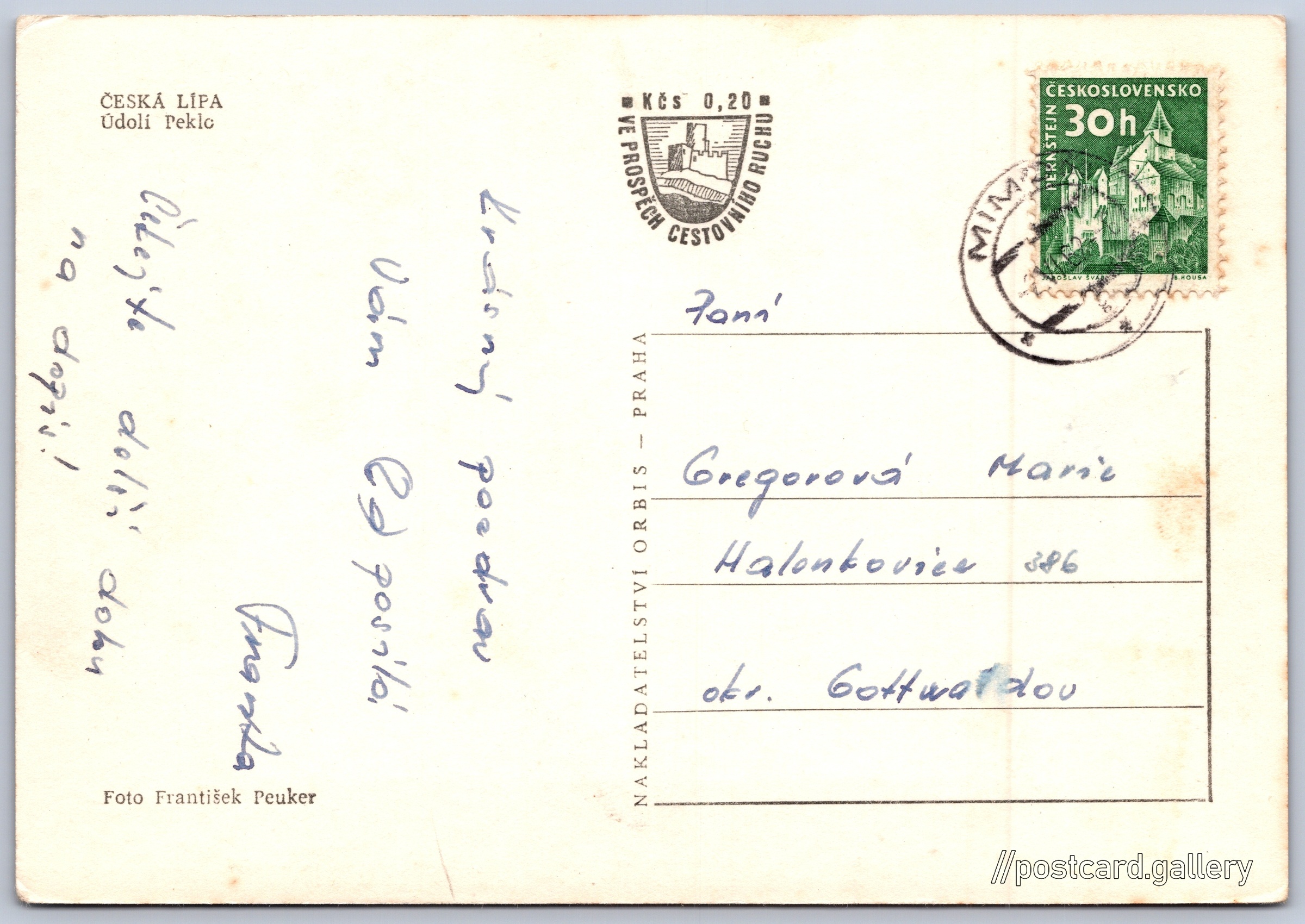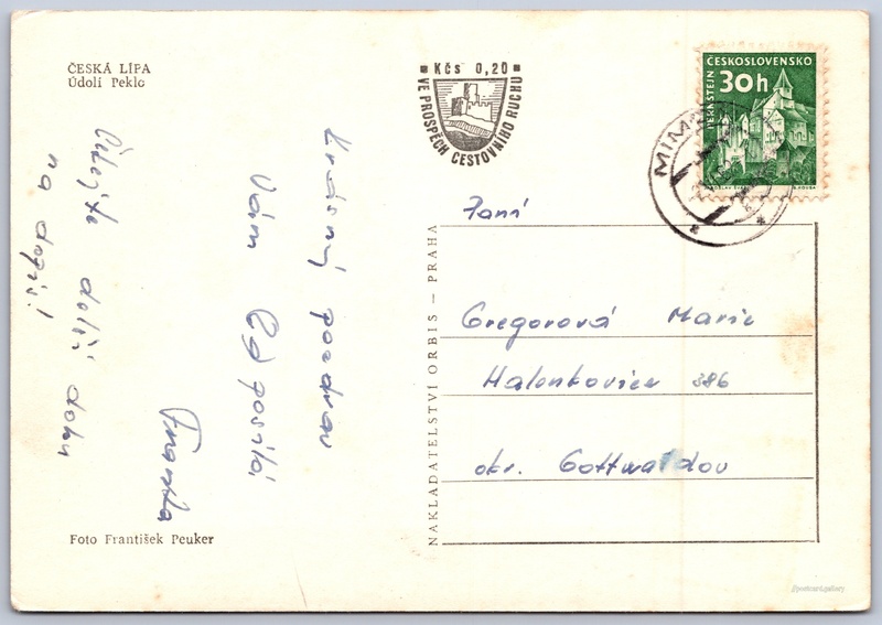 Česká Lípa, údolí Peklo Pokud chcete vidět pohlednice ve vyšším rozlišení nebo zobrazovat jejich zadní stranu, tak se prosím nejdříve přihlašte Přihlásit Zaregistrovat ČESKÁ LÍPAÚdolí Peklo Jazyk tištěného textu na pohlednici: čeština Národní přírodní památka Peklo, Chráněné území, okres Česká Lípa, Liberecký kraj, Česko ukázat na mapě Vydavatel: Nakladatelství Orbis (Československo) Odhadované datum vydání pohlednice: 1959 - 1962 Pomozte nám zpřesnit rok vzniku pohlednice Velikost (š x v) a tvar pohlednice: 146 x 102 mm (5.75" x 4.02"), obdélník Osoby spjaté s touto pohlednicí: František Peuker(Autor fotografie) Prošlá poštou:Datum na razítku: 2.6.1962 Ceny: Příplatek na tur. ruch: 0,20 Kčs (CSK))Vyplacené známky: 0,30 Kčs (CSK) DiskuseVložit příspěvek Přidat novou složku ... Spravovat složky ...