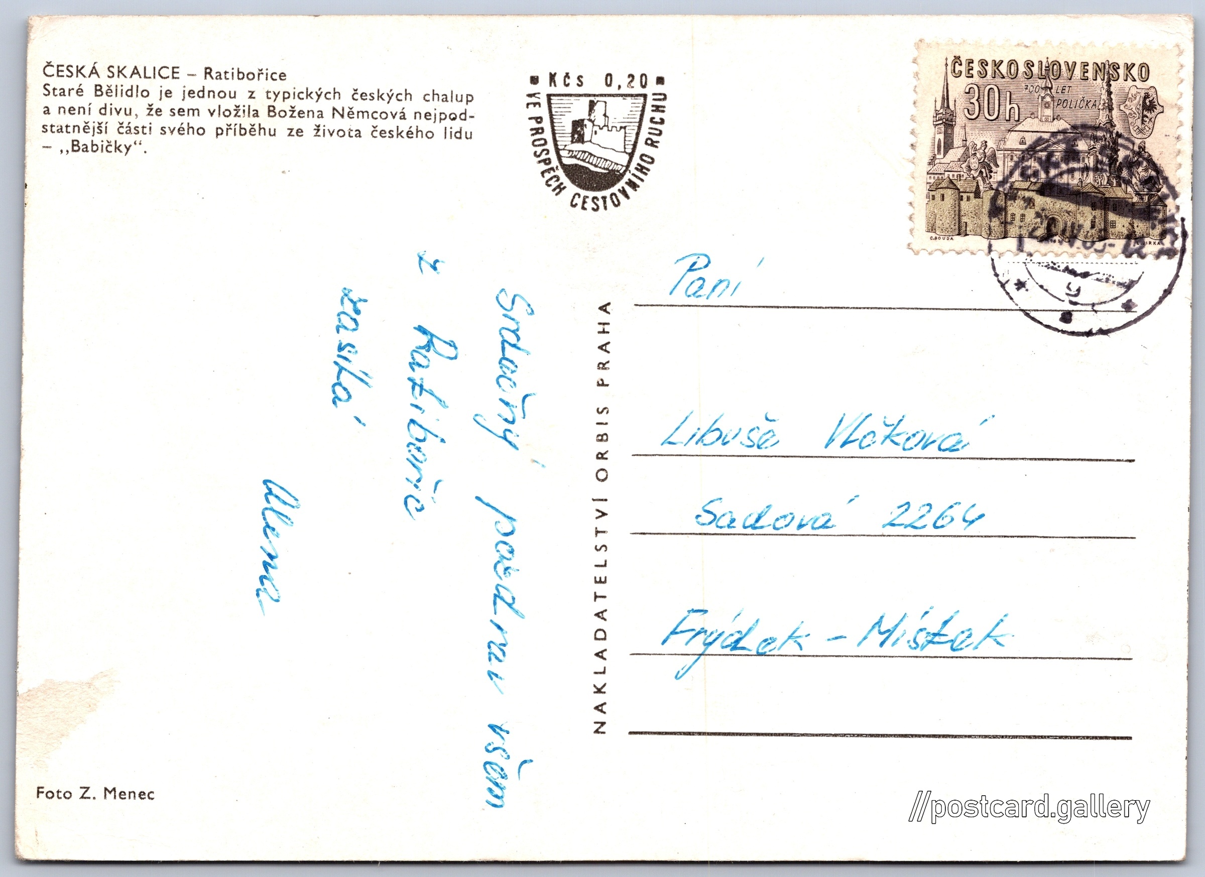 Česká Skalice, Ratibořice, Staré Bělidlo 6/17 Pokud chcete vidět pohlednice ve vyšším rozlišení nebo zobrazovat jejich zadní stranu, tak se prosím nejdříve přihlašte Přihlásit Zaregistrovat ČESKÁ SKALICE - RatibořiceStaré Bělidlo je jednou z typických českých chalup a není divu, že sem vložila Božena Němcová nejpodstatnější části svého příběhu ze života českého lidu - "Babičky". Jazyk tištěného textu na pohlednici: čeština Staré Bělidlo, Lidová architektura, Ratibořice 17, Česká Skalice - Ratibořice, Česko ukázat na mapě V blízkém okolí místa zobrazeného na pohlednici lze najít 17 jiných pohlednic. Zobrazit blízké pohlednice Vydavatel: Nakladatelství Orbis (Československo) Odhadované datum vydání pohlednice: 1963 - 1965 Pomozte nám zpřesnit rok vzniku pohlednice Velikost (š x v) a tvar pohlednice: 146 x 105 mm (5.75" x 4.13"), obdélník Osoby spjaté s touto pohlednicí: Zdeněk Menec(Autor fotografie) Božena Němcová(Obsah pohlednice) Prošlá poštou Ceny: Příplatek na tur. ruch: 0,20 Kčs (CSK))Vyplacené známky: 0,30 Kčs (CSK) DiskuseVložit příspěvek Přidat novou složku ... Spravovat složky ...
