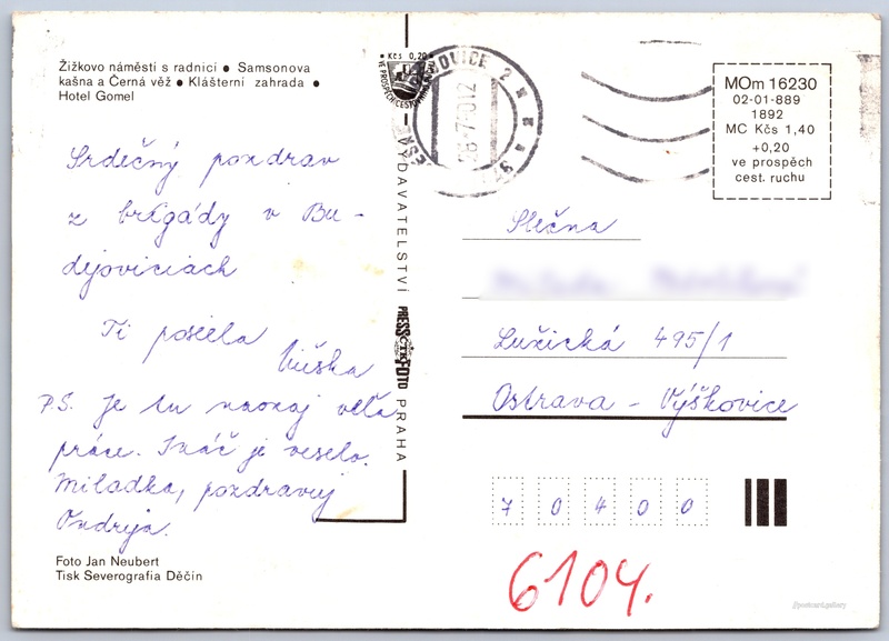 České Budějovice Pokud chcete vidět pohlednice ve vyšším rozlišení nebo zobrazovat jejich zadní stranu, tak se prosím nejdříve přihlašte Přihlásit Zaregistrovat České Budějovice - Žižkovo náměstí s radnicí- Samsonova kašna a Černá věž- Klášterní zahrada- Hotel Gomel Jazyk tištěného textu na pohlednici: čeština nám. Přemysla Otakara II., České Budějovice, České Budějovice ukázat na mapě Vydavatel: PressFoto Praha (Československo) Rok vydání pohlednice: 1988 Velikost (š x v) a tvar pohlednice: 148 x 105 mm (5.83" x 4.13"), obdélník Osoby spjaté s touto pohlednicí: Jan Neubert(Autor fotografie) Prošlá poštou:Datum na razítku: 28.7.1990 Ceny: Cena pohlednice: 1,40 Kčs (CSK) (+0,20 Kčs přípl. na tur. ruch) Kódy na pohlednici: MOm 16230 02-01-889 1892 DiskuseVložit příspěvek Přidat novou složku ... Spravovat složky ...