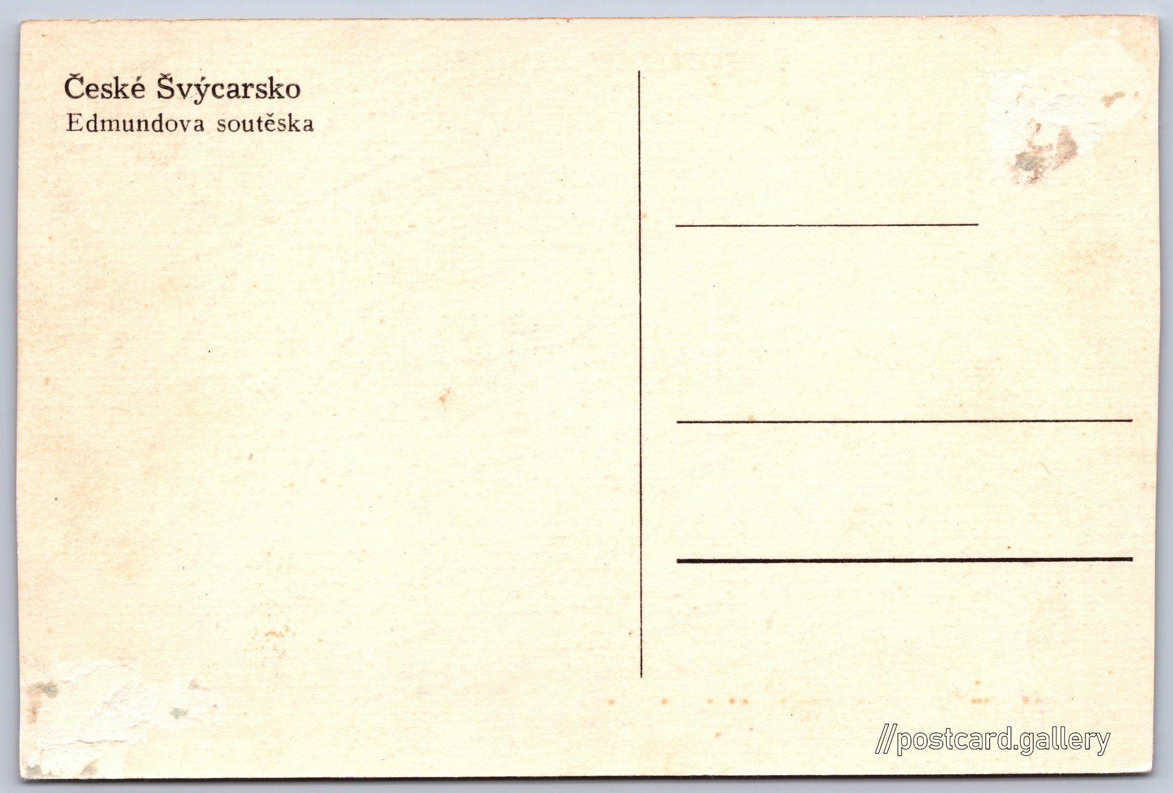 České Švýcarsko, Edmundova soutěska Pokud chcete vidět pohlednice ve vyšším rozlišení nebo zobrazovat jejich zadní stranu, tak se prosím nejdříve přihlašte Přihlásit Zaregistrovat České ŠvýcarskoEdmundova soutěska Jazyk tištěného textu na pohlednici: čeština Mezná, Hřensko, Děčín ukázat na mapě V blízkém okolí místa zobrazeného na pohlednici lze najít 30 jiných pohlednic. Zobrazit blízké pohlednice Datum vydání není známo Pomozte nám odhadnout datum vzniku pohlednice Velikost (š x v) a tvar pohlednice: 135 x 90 mm (5.31" x 3.54"), obdélník Osoby spjaté s touto pohlednicí: Edmund Clary-Aldringen(Jméno v názvu místa) Čistá pohlednice (neprošlá poštou) DiskuseVložit příspěvek Přidat novou složku ... Spravovat složky ...