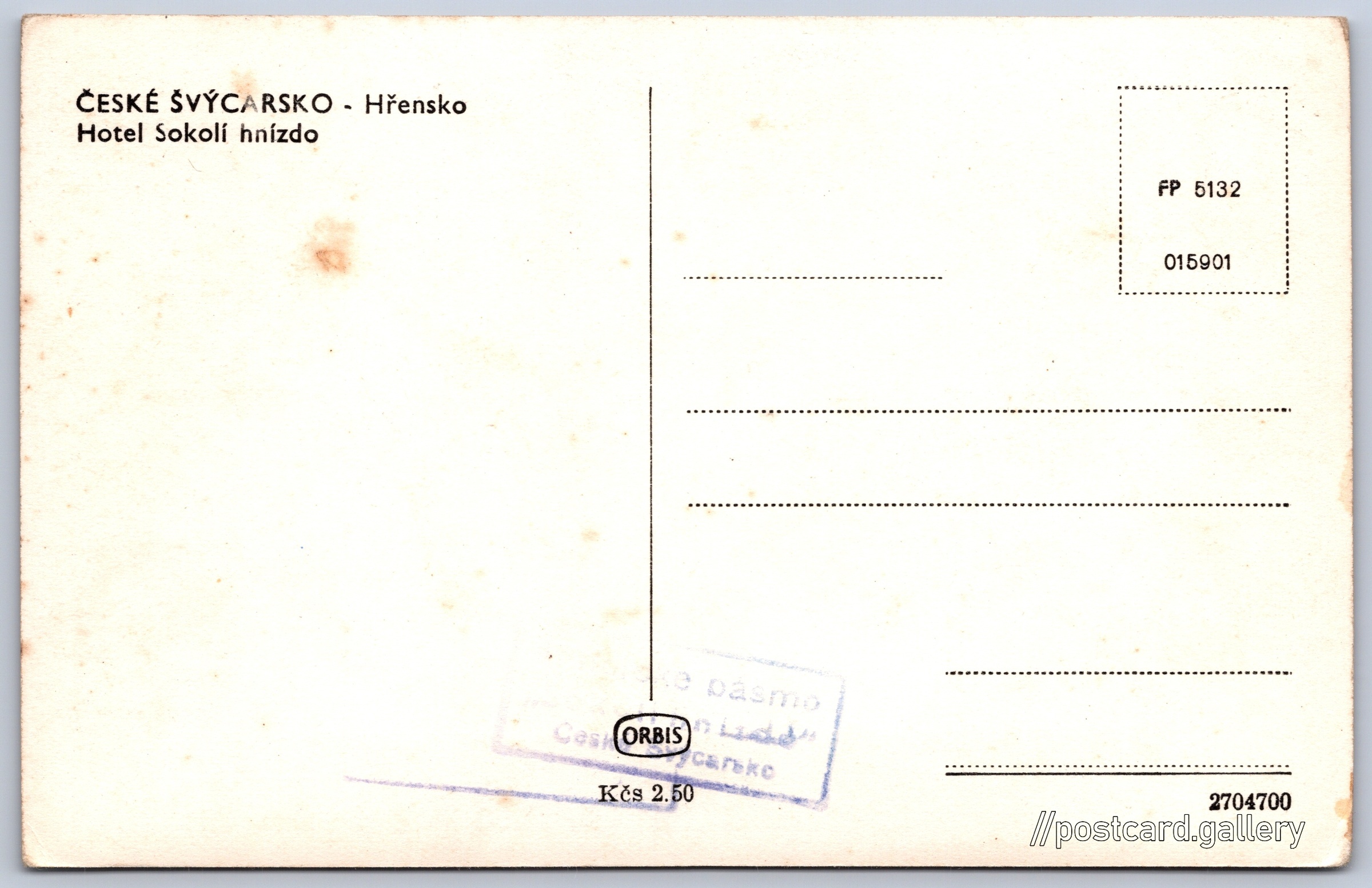 České Švýcarsko, hotel Sokolí hnízdo 1/29 Pokud chcete vidět pohlednice ve vyšším rozlišení nebo zobrazovat jejich zadní stranu, tak se prosím nejdříve přihlašte Přihlásit Zaregistrovat ČESKÉ ŠVÝCARSKO - HřenskoHotel Sokolí hnízdo Jazyk tištěného textu na pohlednici: čeština Výletní zámeček Sokolí hnízdo, Zámek, Hřensko 82, Hřensko, Česko ukázat na mapě V blízkém okolí místa zobrazeného na pohlednici lze najít 29 jiných pohlednic. Zobrazit blízké pohlednice Vydavatel: Nakladatelství Orbis (Československo) Datum vydání není známo Pomozte nám odhadnout datum vzniku pohlednice Velikost (š x v) a tvar pohlednice: 138 x 89 mm (5.43" x 3.50"), obdélník Čistá pohlednice (neprošlá poštou) Ceny: Cena pohlednice: 2,50 Kčs (CSK) Kódy na pohlednici: FP 5132 015901 2704700 DiskuseVložit příspěvek Přidat novou složku ... Spravovat složky ...