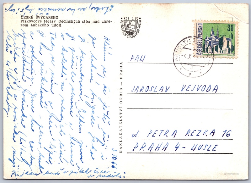 České Švýcarsko, pískovcové terasy Pokud chcete vidět pohlednice ve vyšším rozlišení nebo zobrazovat jejich zadní stranu, tak se prosím nejdříve přihlašte Přihlásit Zaregistrovat ČESKÉ ŠVÝCARSKOPískovcové terasy Děčínských stěn nad zářezem Labského údolí Jazyk tištěného textu na pohlednici: čeština Hřensko, Děčín ukázat na mapě V blízkém okolí místa zobrazeného na pohlednici lze najít 31 jiných pohlednic. Zobrazit blízké pohlednice Vydavatel: Nakladatelství Orbis (Československo) Odhadované datum vydání pohlednice: 1963 - 1966 Pomozte nám zpřesnit rok vzniku pohlednice Velikost (š x v) a tvar pohlednice: 146 x 104 mm (5.75" x 4.09"), obdélník Prošlá poštou:Datum na razítku: 3.10.1966Datum napsání pohledu: 3.10.1966 Ceny: Příplatek na tur. ruch: 0,20 Kčs (CSK))Vyplacené známky: 0,30 Kčs (CSK) DiskuseVložit příspěvek Přidat novou složku ... Spravovat složky ...