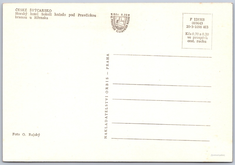 České Švýcarsko, Sokolí hnízdo Pokud chcete vidět pohlednice ve vyšším rozlišení nebo zobrazovat jejich zadní stranu, tak se prosím nejdříve přihlašte Přihlásit Zaregistrovat ČESKÉ ŠVÝCARSKOHorský hotel Sokolí hnízdo pod Pravčickou branou u Hřenska Jazyk tištěného textu na pohlednici: čeština Hřensko 82, Hřensko, 407 17, Děčín ukázat na mapě V blízkém okolí místa zobrazeného na pohlednici lze najít 29 jiných pohlednic. Zobrazit blízké pohlednice Vydavatel: Nakladatelství Orbis (Československo) Rok vydání pohlednice: duben, 1963 Velikost (š x v) a tvar pohlednice: 147 x 102 mm (5.79" x 4.02"), obdélník Osoby spjaté s touto pohlednicí: Otto Rajský(Autor fotografie) Čistá pohlednice (neprošlá poštou) Ceny: Cena pohlednice: 0,70 Kčs (CSK) (+0,20 Kčs přípl. na tur. ruch) Kódy na pohlednici: F 128368 069643 20-3-1098 463 DiskuseVložit příspěvek Přidat novou složku ... Spravovat složky ...
