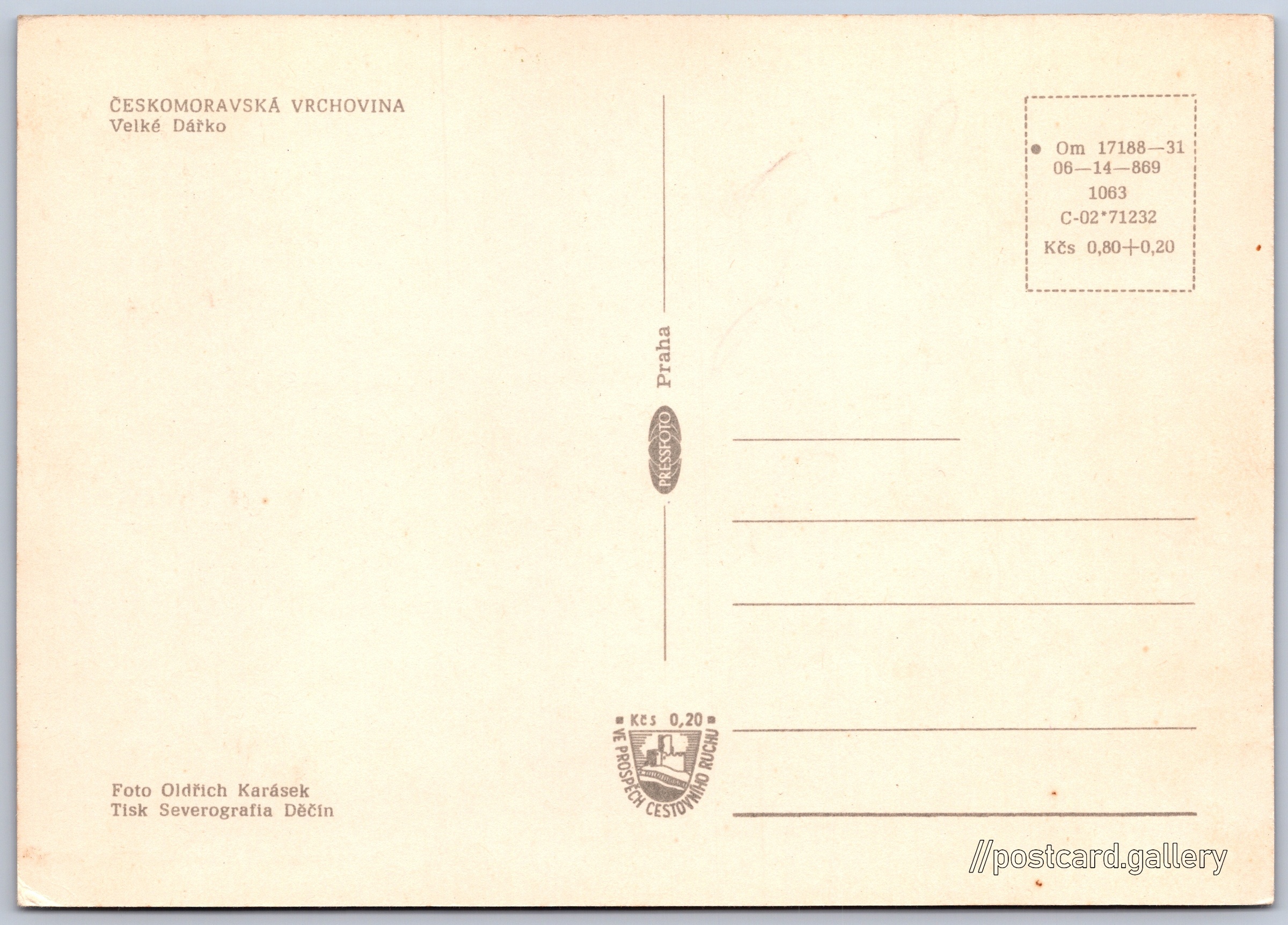 Českomoravská vrchovina, Velké Dářko Pokud chcete vidět pohlednice ve vyšším rozlišení nebo zobrazovat jejich zadní stranu, tak se prosím nejdříve přihlašte Přihlásit Zaregistrovat ČESKOMORAVSKÁ VRCHOVINAVelké Dářko Jazyk tištěného textu na pohlednici: čeština Polnička, Žďár nad Sázavou ukázat na mapě Přesné místo není známo. Pokud jej znáte, tak jej prosím napište do komentářů nebo označte na mapě Vydavatel: PressFoto Praha (Československo) Rok vydání pohlednice: 1968 Velikost (š x v) a tvar pohlednice: 148 x 104 mm (5.83" x 4.09"), obdélník Osoby spjaté s touto pohlednicí: Oldřich Karásek(Autor fotografie) Čistá pohlednice (neprošlá poštou) Ceny: Cena pohlednice: 0,80 Kčs (CSK) (+0,20 Kčs přípl. na tur. ruch) Kódy na pohlednici: •Om 17188-31 06-14-869 1063 C-02*71232 DiskuseVložit příspěvek Přidat novou složku ... Spravovat složky ...
