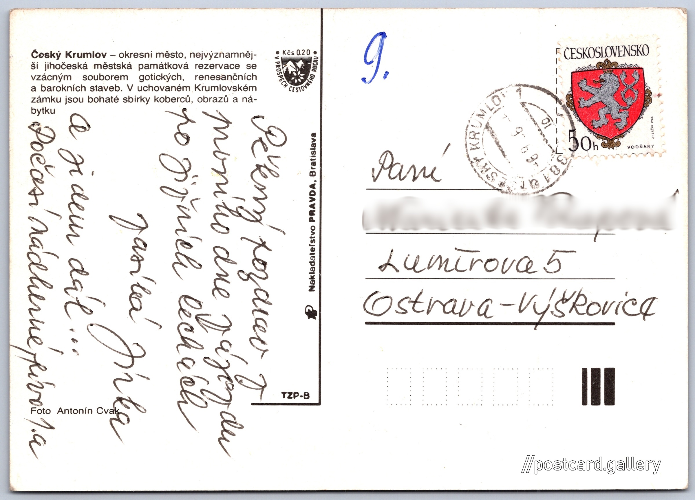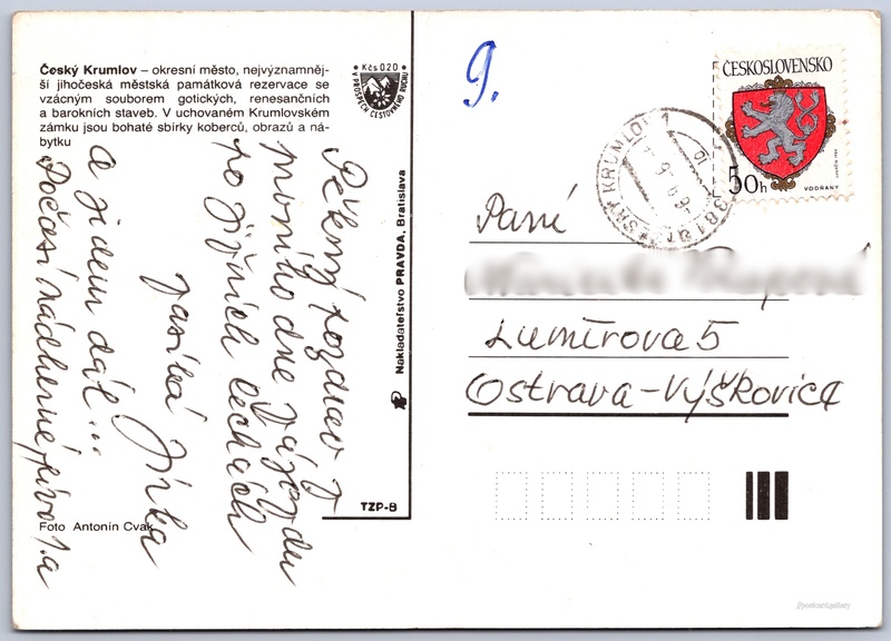 Český Krumlov Pokud chcete vidět pohlednice ve vyšším rozlišení nebo zobrazovat jejich zadní stranu, tak se prosím nejdříve přihlašte Přihlásit Zaregistrovat Český Krumlov Český Krumlov - okresní město, nejvýznamnější jihočeská městská památková rezervace se vzácným souborem gotických, renesančnícha barokních staveb. V uchovaném Krumlovském zámku jsou bohaté sbírky koberců, obrazů a nábytku Jazyk tištěného textu na pohlednici: čeština Český Krumlov, Město, Česko ukázat na mapě Vydavatel: Nakladateľstvo PRAVDA, Bratislava (Československo) Datum vydání není známo Pomozte nám odhadnout datum vzniku pohlednice Velikost (š x v) a tvar pohlednice: 147 x 105 mm (5.79" x 4.13"), obdélník Osoby spjaté s touto pohlednicí: Antonín Cvak(Autor fotografie) Prošlá poštou Ceny: Příplatek na tur. ruch: 0,20 Kčs (CSK))Vyplacené známky: 0,50 Kčs (CSK) DiskuseVložit příspěvek Přidat novou složku ... Spravovat složky ...