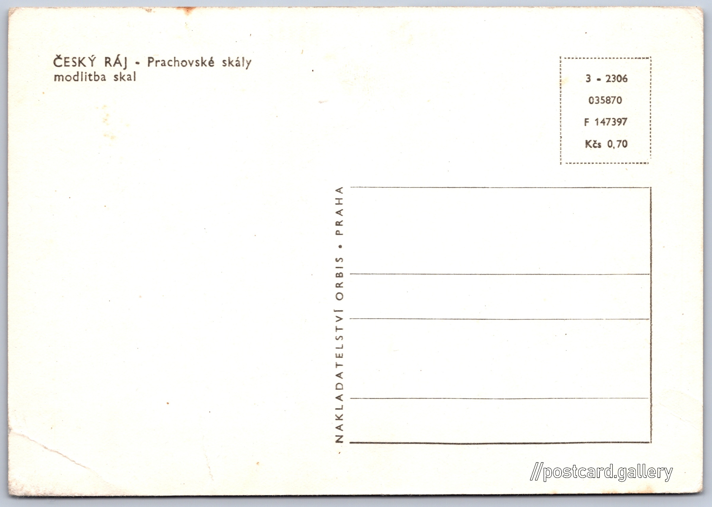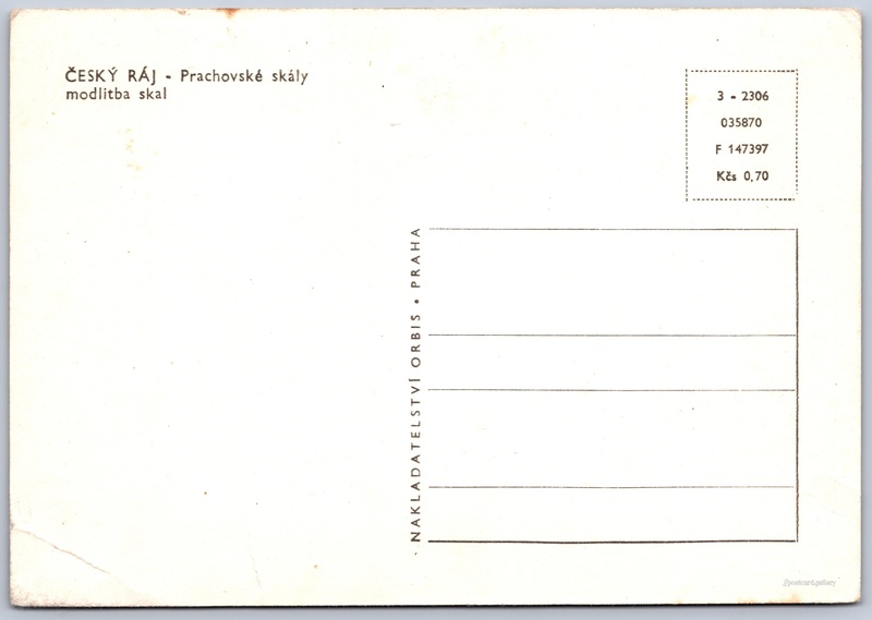 Český ráj, Prachovské skály 3/13 Pokud chcete vidět pohlednice ve vyšším rozlišení nebo zobrazovat jejich zadní stranu, tak se prosím nejdříve přihlašte Přihlásit Zaregistrovat ČESKÝ RÁJ - Prachovské skálymodlitba skal Jazyk tištěného textu na pohlednici: čeština Skalní věž Mnich, Lezecký terén, Holín - Horní Lochov, Česko ukázat na mapě V blízkém okolí místa zobrazeného na pohlednici lze najít 13 jiných pohlednic. Zobrazit blízké pohlednice Vydavatel: Nakladatelství Orbis (Československo) Datum vydání není známo Pomozte nám odhadnout datum vzniku pohlednice Velikost (š x v) a tvar pohlednice: 147 x 102 mm (5.79" x 4.02"), obdélník Čistá pohlednice (neprošlá poštou) Ceny: Cena pohlednice: 0,70 Kčs (CSK) Kódy na pohlednici: 3-2306 035870 F 147397 DiskuseVložit příspěvek Přidat novou složku ... Spravovat složky ...