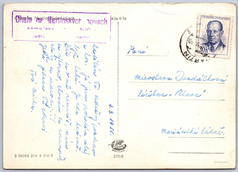 Chata na Martinských holích Pokud chcete vidět pohlednice ve vyšším rozlišení nebo zobrazovat jejich zadní stranu, tak se prosím nejdříve přihlašte Přihlásit Zaregistrovat Chata na Martinských holiach Jazyk tištěného textu na pohlednici: slovenština Chata na Martinských holiach, Chata, bouda, Martinské Hole 451, Martin, Slovensko ukázat na mapě V blízkém okolí místa zobrazeného na pohlednici lze najít 1 jinou pohlednici. Zobrazit blízké pohlednice Vydavatel: Tvar Bratislava (Československo) Rok vydání pohlednice: únor, 1954 Velikost (š x v) a tvar pohlednice: 148 x 105 mm (5.83" x 4.13"), obdélník Prošlá poštou:Datum napsání pohledu: 3.9.1958 Ceny: Cena pohlednice: 0,70 Kčs (CSK)Vyplacené známky: 0,30 Kčs (CSK) Kódy na pohlednici: 275/2 3 56284 254 F 51617 DiskuseVložit příspěvek Přidat novou složku ... Spravovat složky ...
