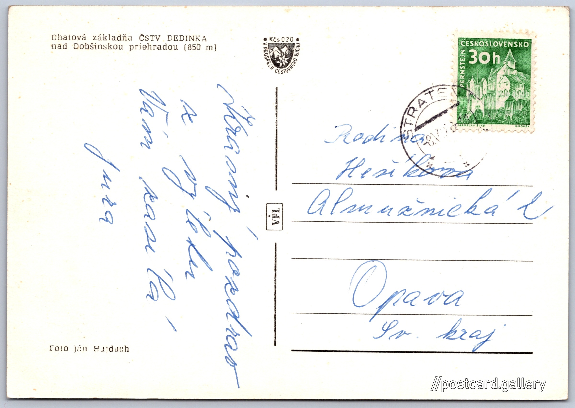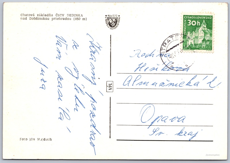 Chatová základna ČSTV Dedinka 2/8 Pokud chcete vidět pohlednice ve vyšším rozlišení nebo zobrazovat jejich zadní stranu, tak se prosím nejdříve přihlašte Přihlásit Zaregistrovat Chatová základňa ČSTV DEDINKA nad Dobšinskou priehradou (850 m) Jazyk tištěného textu na pohlednici: slovenština Dedinky ukázat na mapě Přesné místo není známo. Pokud jej znáte, tak jej prosím napište do komentářů nebo označte na mapě Vydavatel: VPL (Československo) Datum vydání není známo Pomozte nám odhadnout datum vzniku pohlednice Velikost (š x v) a tvar pohlednice: 147 x 102 mm (5.79" x 4.02"), obdélník Osoby spjaté s touto pohlednicí: Ján Hajduch(Autor fotografie) Prošlá poštou Ceny: Příplatek na tur. ruch: 0,20 Kčs (CSK))Vyplacené známky: 0,30 Kčs (CSK) DiskuseVložit příspěvek Přidat novou složku ... Spravovat složky ...