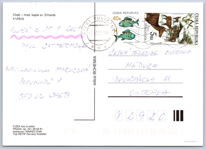 Cheb, kaple sv. Erharda a Uršuly Pokud chcete vidět pohlednice ve vyšším rozlišení nebo zobrazovat jejich zadní stranu, tak se prosím nejdříve přihlašte Přihlásit Zaregistrovat Cheb – hrad, kaple sv. Erharda a Uršuly Jazyk tištěného textu na pohlednici: čeština Kaple sv. Martina, Erharda a Uršuly, Kaple, Cheb, Česko ukázat na mapě V blízkém okolí místa zobrazeného na pohlednici lze najít 50 jiných pohlednic. Zobrazit blízké pohlednice Vydavatel: TANASO Cheb (Česko) Odhadované datum vydání pohlednice: 1998 - 2001 Pomozte nám zpřesnit rok vzniku pohlednice Velikost (š x v) a tvar pohlednice: 147 x 105 mm (5.79" x 4.13"), obdélník Prošlá poštou:Datum na razítku: 1.2.2001 Ceny: Vyplacené známky: 5,40 Kč (CZK) DiskuseVložit příspěvek Přidat novou složku ... Spravovat složky ...