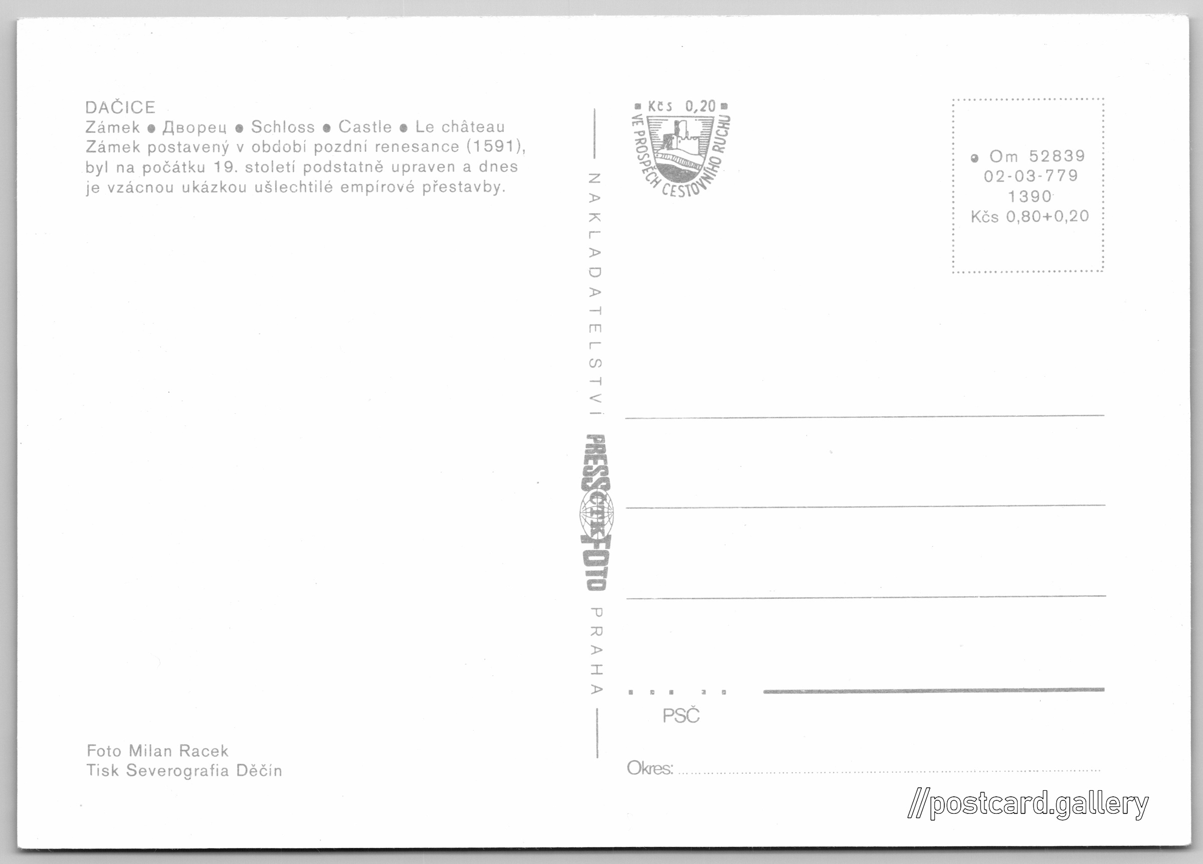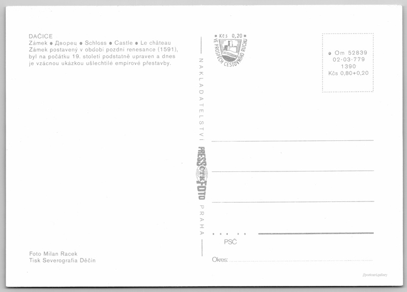 Dačice, zámek Pokud chcete vidět pohlednice ve vyšším rozlišení nebo zobrazovat jejich zadní stranu, tak se prosím nejdříve přihlašte Přihlásit Zaregistrovat DAČICEZámek - Дворец - Schloss - Castle - Le châteauZámek postavený v období pozdní renesance (1591), byl na počátku 19. století podstatně upraven a dnes je vzácnou ukázkou ušlechtilé empírové přestavby. Jazyk tištěného textu na pohlednici: čeština Zámek Dačice, Zámek, Dačice I, Česko ukázat na mapě V blízkém okolí místa zobrazeného na pohlednici lze najít 3 jiné pohlednice. Zobrazit blízké pohlednice Vydavatel: PressFoto Praha (Československo) Rok vydání pohlednice: 1977 Velikost (š x v) a tvar pohlednice: 146 x 104 mm (5.75" x 4.09"), obdélník Osoby spjaté s touto pohlednicí: Milan Racek(Autor fotografie) Čistá pohlednice (neprošlá poštou) Ceny: Cena pohlednice: 0,80 Kčs (CSK) (+0,20 Kčs přípl. na tur. ruch) Kódy na pohlednici: •Om 52839 02-03-779 1390 DiskuseVložit příspěvek Přidat novou složku ... Spravovat složky ...