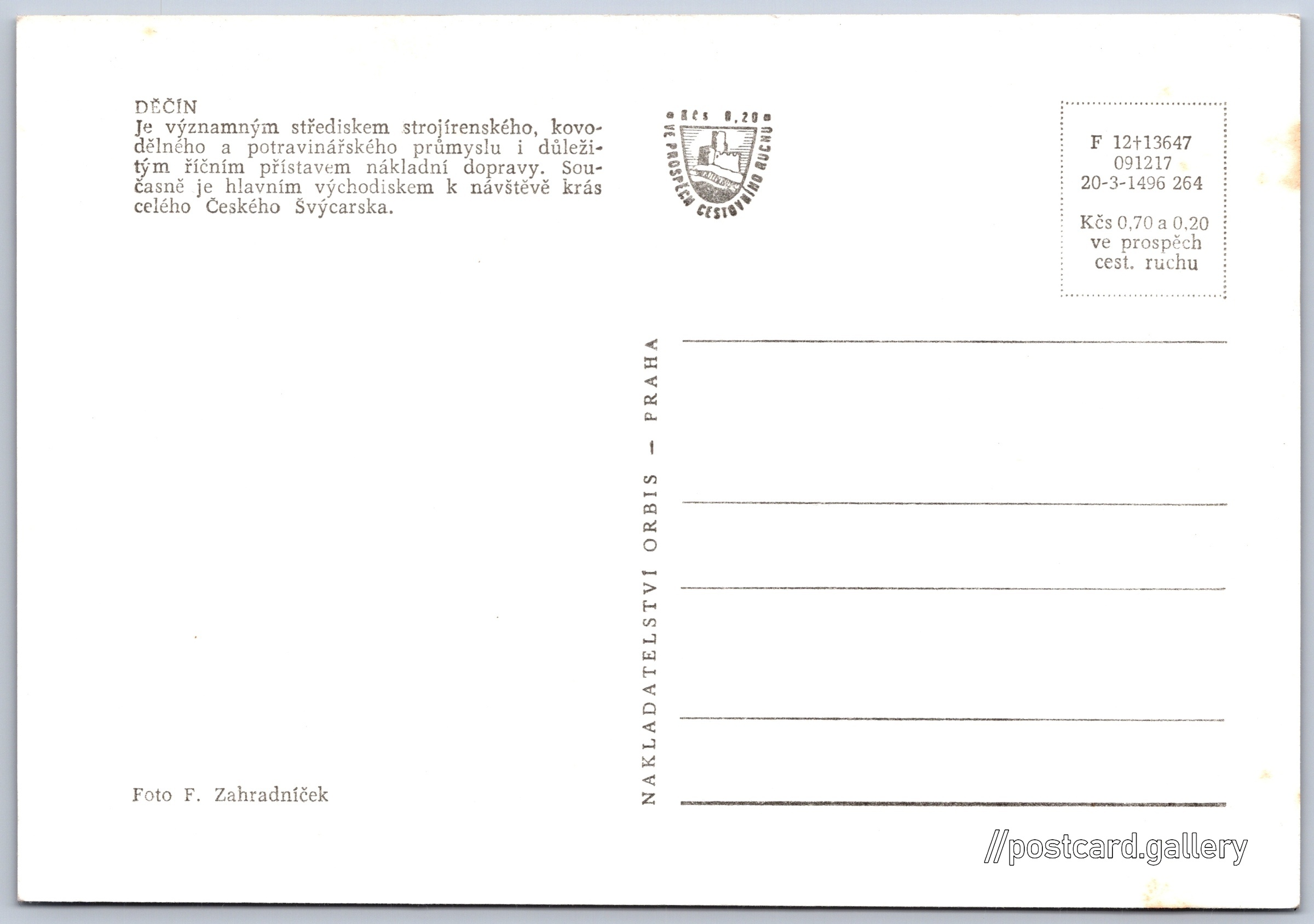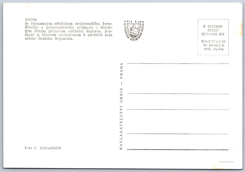Děčín, pohled z vyhlídky nad městem 8/8 Pokud chcete vidět pohlednice ve vyšším rozlišení nebo zobrazovat jejich zadní stranu, tak se prosím nejdříve přihlašte Přihlásit Zaregistrovat DĚČÍNJe významným střediskem strojírenského, kovodělného a potravinářského průmyslu i důležitým říčním přístavem nákladní dopravy. Současně je hlavním východiskem k návštěvě krás celého Českého Švýcarska. Jazyk tištěného textu na pohlednici: čeština Císařský výhled, Vyhlídka, Děčín, Česko ukázat na mapě V blízkém okolí místa zobrazeného na pohlednici lze najít 8 jiných pohlednic. Zobrazit blízké pohlednice Vydavatel: Nakladatelství Orbis (Československo) Rok vydání pohlednice: únor, 1964 Velikost (š x v) a tvar pohlednice: 148 x 103 mm (5.83" x 4.06"), obdélník Osoby spjaté s touto pohlednicí: František Zahradníček(Autor fotografie) Čistá pohlednice (neprošlá poštou) Ceny: Cena pohlednice: 0,70 Kčs (CSK) (+0,20 Kčs přípl. na tur. ruch) Kódy na pohlednici: F 12+13647 091217 20-3-1496 264 DiskuseVložit příspěvek Přidat novou složku ... Spravovat složky ...