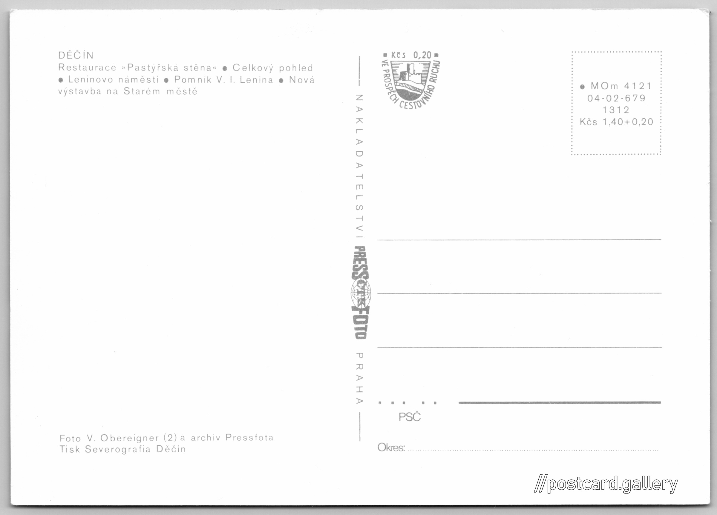 Děčín Pokud chcete vidět pohlednice ve vyšším rozlišení nebo zobrazovat jejich zadní stranu, tak se prosím nejdříve přihlašte Přihlásit Zaregistrovat Děčín DĚČÍN- Restaurace "Pastýřská stěna"- Celkový pohled- Leninovo náměstí- Pomník V. I. Lenina- Nová výstavba na Starém městě Jazyk tištěného textu na pohlednici: čeština Restaurace Pastýřská stěna, Žižkova 236/6, Děčín IV-Podmokly, Česko ukázat na mapě V blízkém okolí místa zobrazeného na pohlednici lze najít 8 jiných pohlednic. Zobrazit blízké pohlednice Vydavatel: PressFoto Praha (Československo) Rok vydání pohlednice: 1976 Velikost (š x v) a tvar pohlednice: 148 x 105 mm (5.83" x 4.13"), obdélník Osoby spjaté s touto pohlednicí: V. I. Lenin(Obsah pohlednice) Vojtěch Obereigner(Autor fotografie) Čistá pohlednice (neprošlá poštou) Ceny: Cena pohlednice: 1,40 Kčs (CSK) (+0,20 Kčs přípl. na tur. ruch) Kódy na pohlednici: •MOm 4121 04-02-679 1312 DiskuseVložit příspěvek Přidat novou složku ... Spravovat složky ...