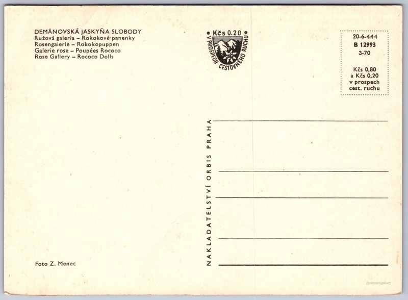 Demänovská jaskyňa slobody Pokud chcete vidět pohlednice ve vyšším rozlišení nebo zobrazovat jejich zadní stranu, tak se prosím nejdříve přihlašte Přihlásit Zaregistrovat DEMÄNOVSKÁ JASKYŇA SLOBODYRužová galeria - Rokokové panenkyRosengalerie - RokokopuppenGalerie rose - Poupées RococoRose Gallery - Rococo Dolls Jazyk tištěného textu na pohlednici: slovenština Demänovská jeskyně svobody, Jeskyně, Demänovská Dolina 27, Demänovská Dolina, Slovensko ukázat na mapě V blízkém okolí místa zobrazeného na pohlednici lze najít 29 jiných pohlednic. Zobrazit blízké pohlednice Vydavatel: Nakladatelství Orbis (Československo) Datum vydání není známo Pomozte nám odhadnout datum vzniku pohlednice Velikost (š x v) a tvar pohlednice: 146 x 106 mm (5.75" x 4.17"), obdélník Osoby spjaté s touto pohlednicí: Zdeněk Menec(Autor fotografie) Čistá pohlednice (neprošlá poštou) Ceny: Cena pohlednice: 0,80 Kčs (CSK) (+0,20 Kčs přípl. na tur. ruch) Kódy na pohlednici: 20-6-444 B 12993 3-70 DiskuseVložit příspěvek Přidat novou složku ... Spravovat složky ...
