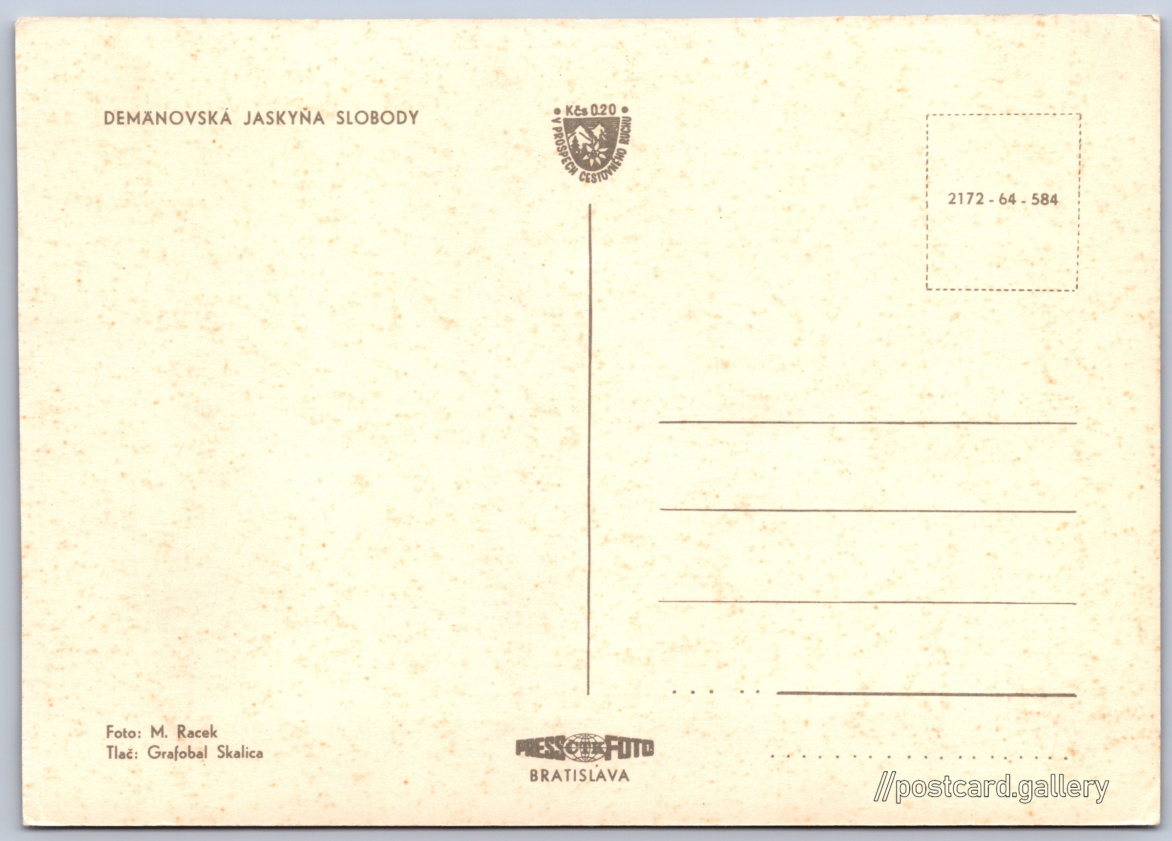 Demänovská jeskyně svobody 6/53 Pokud chcete vidět pohlednice ve vyšším rozlišení nebo zobrazovat jejich zadní stranu, tak se prosím nejdříve přihlašte Přihlásit Zaregistrovat DEMÄNOVSKÁ JASKYŇA SLOBODY Jazyk tištěného textu na pohlednici: slovenština Demänovská jeskyně svobody, Jeskyně, Demänovská Dolina 27, Demänovská Dolina, Slovensko ukázat na mapě V blízkém okolí místa zobrazeného na pohlednici lze najít 29 jiných pohlednic. Zobrazit blízké pohlednice Vydavatel: PressFoto Bratislava (Československo) Datum vydání není známo Pomozte nám odhadnout datum vzniku pohlednice Velikost (š x v) a tvar pohlednice: 149 x 105 mm (5.87" x 4.13"), obdélník Osoby spjaté s touto pohlednicí: Milan Racek(Autor fotografie) Čistá pohlednice (neprošlá poštou) Ceny: Příplatek na tur. ruch: 0,20 Kčs (CSK)) Kódy na pohlednici: 2172-64-584 DiskuseVložit příspěvek Přidat novou složku ... Spravovat složky ...