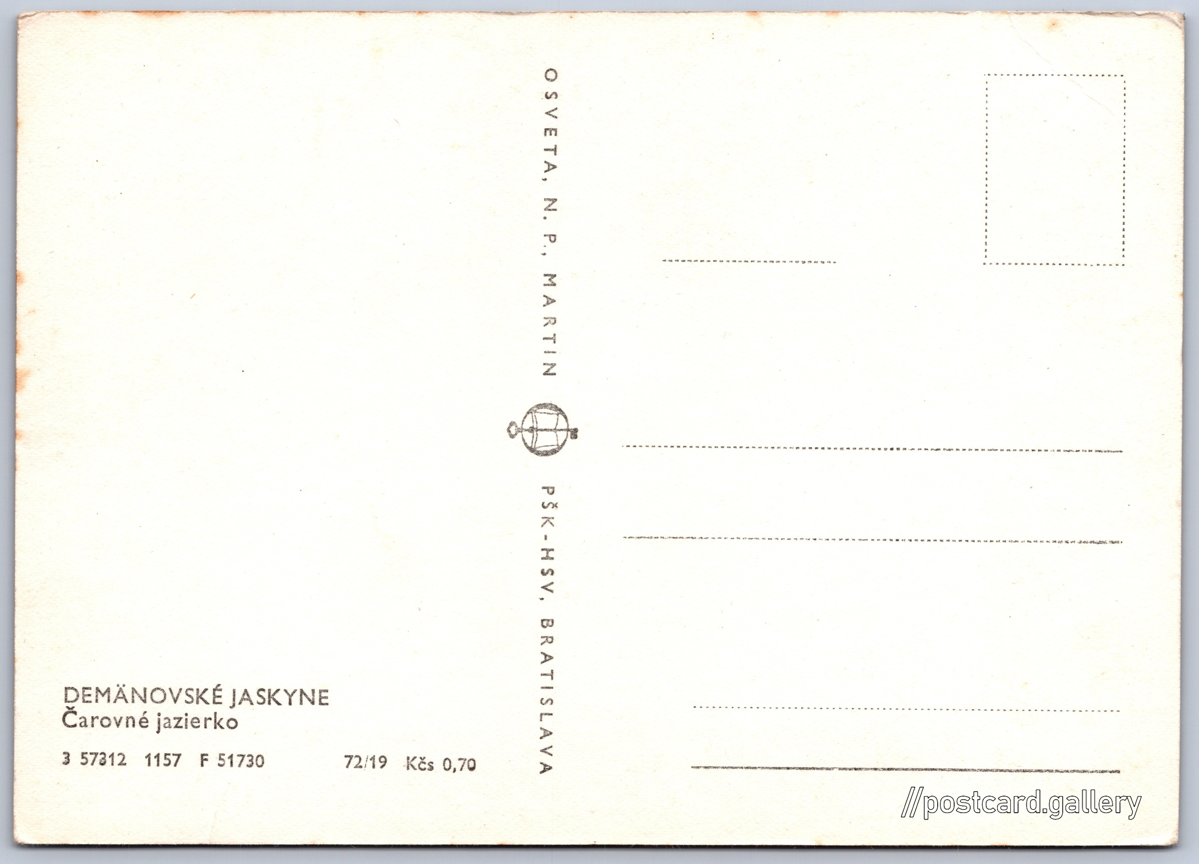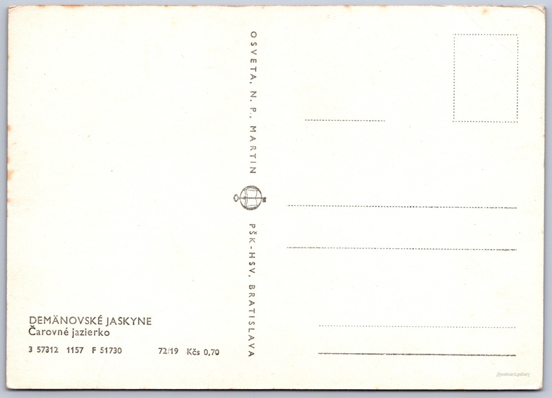 Demenovské jeskyně, Čarovné jezírko 10/29 Pokud chcete vidět pohlednice ve vyšším rozlišení nebo zobrazovat jejich zadní stranu, tak se prosím nejdříve přihlašte Přihlásit Zaregistrovat DEMÄNOVSKÉ JASKYNEČarovné jazierko Jazyk tištěného textu na pohlednici: slovenština Demänovská ledová jeskyně, Jeskyně, Demänovská Dolina, Slovensko ukázat na mapě V blízkém okolí místa zobrazeného na pohlednici lze najít 12 jiných pohlednic. Zobrazit blízké pohlednice Vydavatel: Osveta, n. p., Martin PŠK - Bratislava (Československo) Rok vydání pohlednice: listopad, 1957 Velikost (š x v) a tvar pohlednice: 147 x 105 mm (5.79" x 4.13"), obdélník Čistá pohlednice (neprošlá poštou) Ceny: Cena pohlednice: 0,70 Kčs (CSK) Kódy na pohlednici: 3 57312 1157 F 51730 72/19 DiskuseVložit příspěvek Přidat novou složku ... Spravovat složky ...