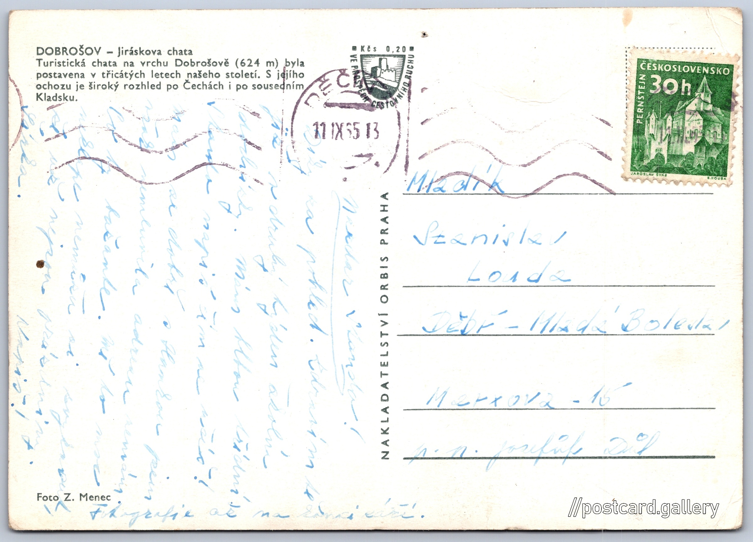 Dobrošov, Jiráskova chata Pokud chcete vidět pohlednice ve vyšším rozlišení nebo zobrazovat jejich zadní stranu, tak se prosím nejdříve přihlašte Přihlásit Zaregistrovat DOBROŠOV - Jiráskova chataTuristická chata na vrchu Dobrošově (624 m) byla postavena v třicátých letech našeho století. S jejího ochozu je široký rozhled po Čechách i po sousedním Kladsku. Jazyk tištěného textu na pohlednici: čeština Jiráskova Chata, Dobrošov 71, Náchod - Dobrošov, Česko ukázat na mapě V blízkém okolí místa zobrazeného na pohlednici lze najít 16 jiných pohlednic. Zobrazit blízké pohlednice Vydavatel: Nakladatelství Orbis (Československo) Odhadované datum vydání pohlednice: 1962 - 1965 Pomozte nám zpřesnit rok vzniku pohlednice Velikost (š x v) a tvar pohlednice: 146 x 103 mm (5.75" x 4.06"), obdélník Osoby spjaté s touto pohlednicí: Zdeněk Menec(Autor fotografie) Prošlá poštou:Datum na razítku: 11.9.1965 Ceny: Příplatek na tur. ruch: 0,20 Kčs (CSK))Vyplacené známky: 0,30 Kčs (CSK) DiskuseVložit příspěvek Přidat novou složku ... Spravovat složky ...