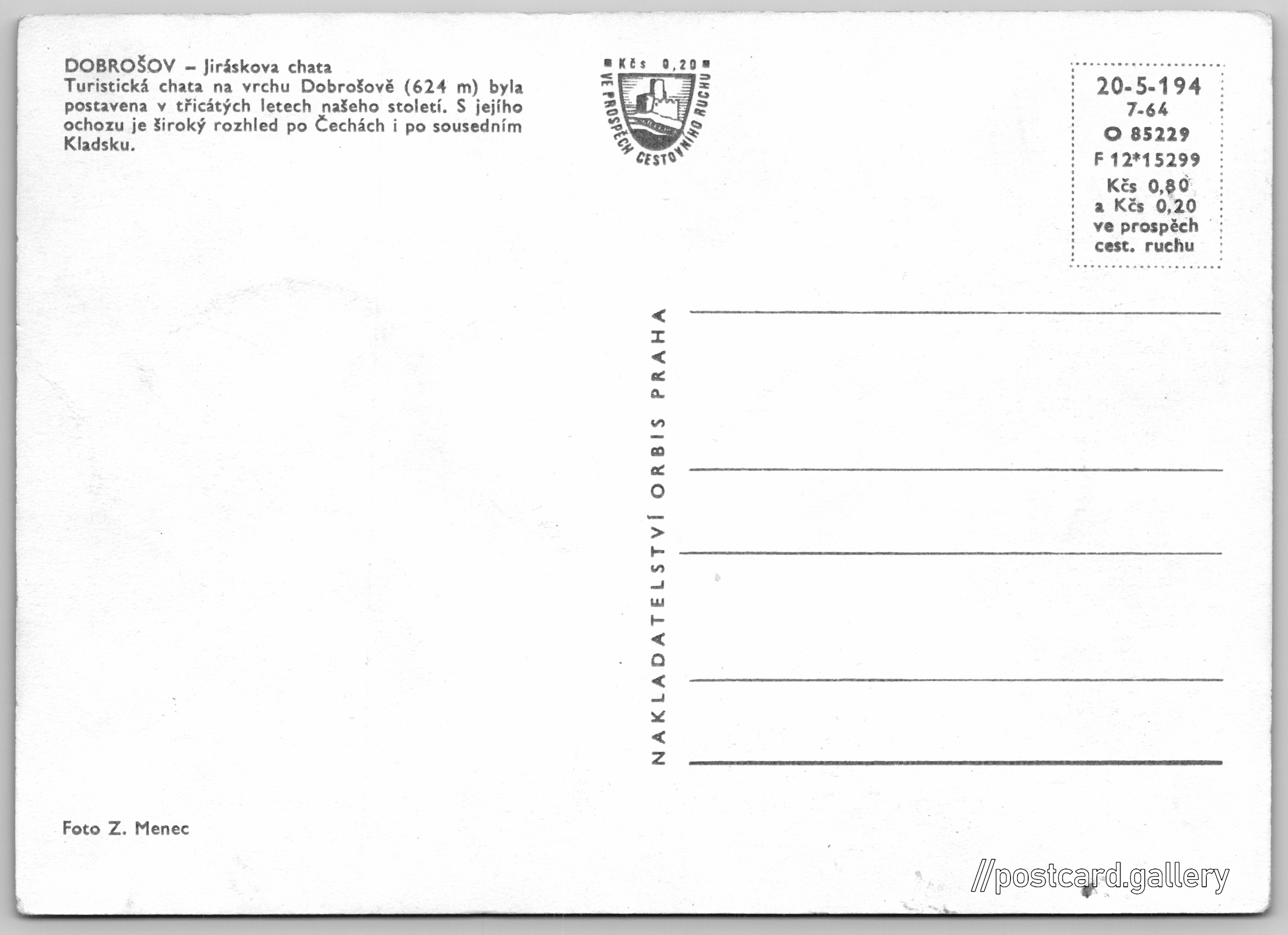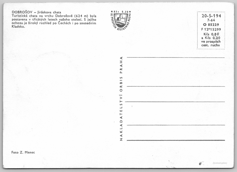 Dobrošov, Jiráskova chata Pokud chcete vidět pohlednice ve vyšším rozlišení nebo zobrazovat jejich zadní stranu, tak se prosím nejdříve přihlašte Přihlásit Zaregistrovat DOBROŠOV - Jiráskova chataTuristická chata na vrchu Dobrošově (624 m) byla postavena v třicátých letech našeho století. S jejího ochozu je široký rozhled po Čechách i po sousedním Kladsku. Jazyk tištěného textu na pohlednici: čeština Dobrošov, Náchod, Náchod ukázat na mapě V blízkém okolí místa zobrazeného na pohlednici lze najít 16 jiných pohlednic. Zobrazit blízké pohlednice Vydavatel: Nakladatelství Orbis (Československo) Rok vydání pohlednice: červenec, 1964 Velikost (š x v) a tvar pohlednice: 147 x 105 mm (5.79" x 4.13"), obdélník Osoby spjaté s touto pohlednicí: Zdeněk Menec(Autor fotografie) Čistá pohlednice (neprošlá poštou) Ceny: Cena pohlednice: 0,80 Kčs (CSK) (+0,20 Kčs přípl. na tur. ruch) Kódy na pohlednici: 20-5-194 7-64 O 85229 F 12*15299 DiskuseVložit příspěvek Přidat novou složku ... Spravovat složky ...