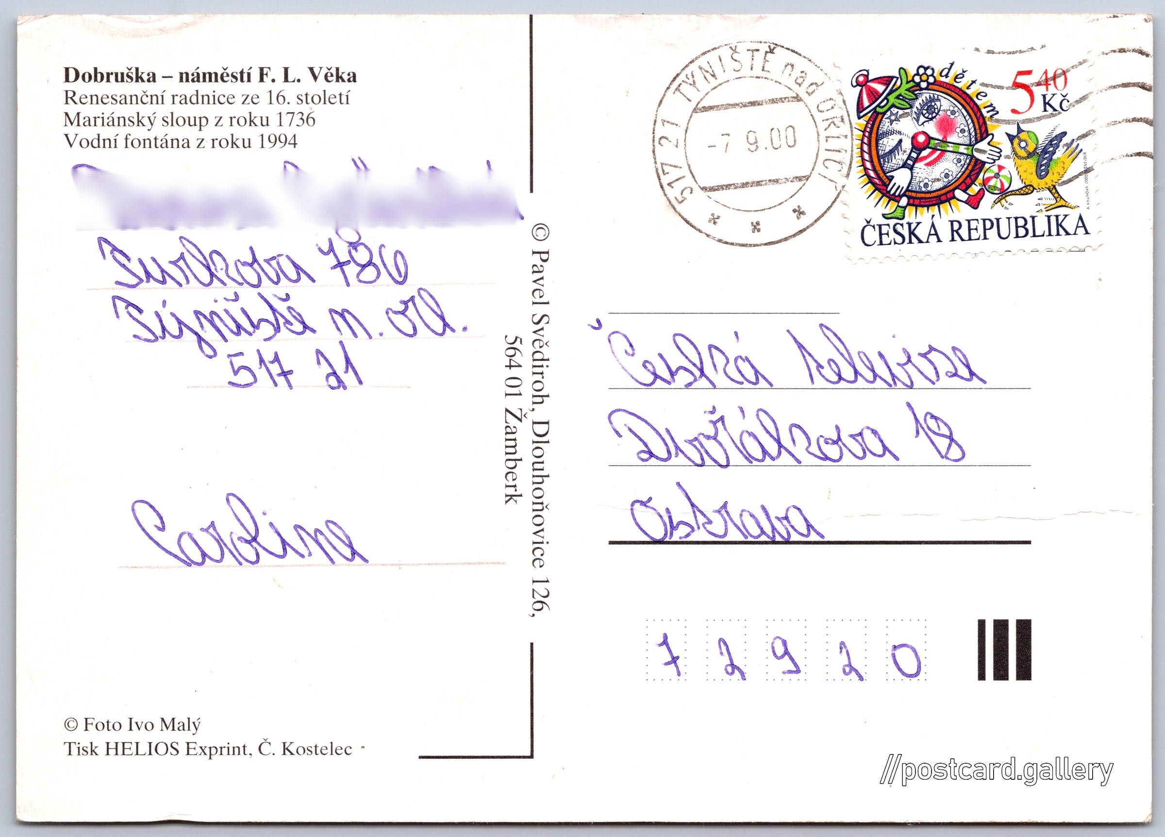 Dobruška, náměstí 7/7 Pokud chcete vidět pohlednice ve vyšším rozlišení nebo zobrazovat jejich zadní stranu, tak se prosím nejdříve přihlašte Přihlásit Zaregistrovat Dobruška Dobruška - náměstí F. L. VěkaRenesanční radnice ze 16. stoletíMariánský sloup z roku 1736Vodní fontána z roku 1994 Jazyk tištěného textu na pohlednici: čeština nám. F. L. Věka 1, Dobruška, 518 01, Rychnov nad Kněžnou ukázat na mapě V blízkém okolí místa zobrazeného na pohlednici lze najít 7 jiných pohlednic. Zobrazit blízké pohlednice Vydavatel: Pavel Svědiroh (Česko) Odhadované datum vydání pohlednice: 1997 - 2000 Pomozte nám zpřesnit rok vzniku pohlednice Velikost (š x v) a tvar pohlednice: 147 x 105 mm (5.79" x 4.13"), obdélník Osoby spjaté s touto pohlednicí: Ivo Malý(Autor fotografie) Prošlá poštou:Datum na razítku: 7.9.2000 Ceny: Vyplacené známky: 5,40 Kč (CZK) DiskuseVložit příspěvek Přidat novou složku ... Spravovat složky ...