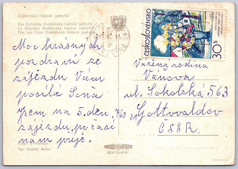 Dobšinská ľadová jaskyňa Pokud chcete vidět pohlednice ve vyšším rozlišení nebo zobrazovat jejich zadní stranu, tak se prosím nejdříve přihlašte Přihlásit Zaregistrovat Dobšinská ľadová jaskyňaDie Eishöhle Dobšinská ľadová jaskyňaLa Glacière Dobšinská ľadová jaskyňaThe Ice-Cave Dobšinská ľadová jaskyňa Jazyk tištěného textu na pohlednici: slovenština Dobšinská ledová jeskyně, Jeskyně, Dobšiná, Slovensko ukázat na mapě V blízkém okolí místa zobrazeného na pohlednici lze najít 1 jinou pohlednici. Zobrazit blízké pohlednice Vydavatel: PressFoto Bratislava (Československo) Odhadované datum vydání pohlednice: 1969 - 1972 Pomozte nám zpřesnit rok vzniku pohlednice Velikost (š x v) a tvar pohlednice: 148 x 103 mm (5.83" x 4.06"), obdélník Osoby spjaté s touto pohlednicí: Štefan Hamza(Autor fotografie) Prošlá poštou:Datum na razítku: 16.7.1972 Ceny: Příplatek na tur. ruch: 0,20 Kčs (CSK))Vyplacené známky: 0,30 Kčs (CSK) DiskuseVložit příspěvek Přidat novou složku ... Spravovat složky ...