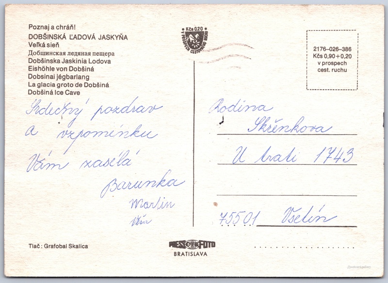 Dobšinská ledová jeskyně Pokud chcete vidět pohlednice ve vyšším rozlišení nebo zobrazovat jejich zadní stranu, tak se prosím nejdříve přihlašte Přihlásit Zaregistrovat Poznaj a chráň!DOBŠINSKÁ ĽADOVÁ JASKYŇAVeľká sieň- Добшинская ледяная пещера- Dobšinska Jaskinia Lodova- Eishöhle von Dobšiná- Dobsinai jégbarlang- La glacia groto de Dobšiná- Dobšiná Ice Cave Jazyk tištěného textu na pohlednici: slovenština Dobšinská ledová jeskyně, Jeskyně, Dobšiná, Slovensko ukázat na mapě V blízkém okolí místa zobrazeného na pohlednici lze najít 1 jinou pohlednici. Zobrazit blízké pohlednice Vydavatel: PressFoto Bratislava (Československo) Datum vydání není známo Pomozte nám odhadnout datum vzniku pohlednice Velikost (š x v) a tvar pohlednice: 146 x 104 mm (5.75" x 4.09"), obdélník Prošlá poštou Ceny: Cena pohlednice: 0,90 Kčs (CSK) (+0,20 Kčs přípl. na tur. ruch) Kódy na pohlednici: 2176-026-386 DiskuseVložit příspěvek Přidat novou složku ... Spravovat složky ...