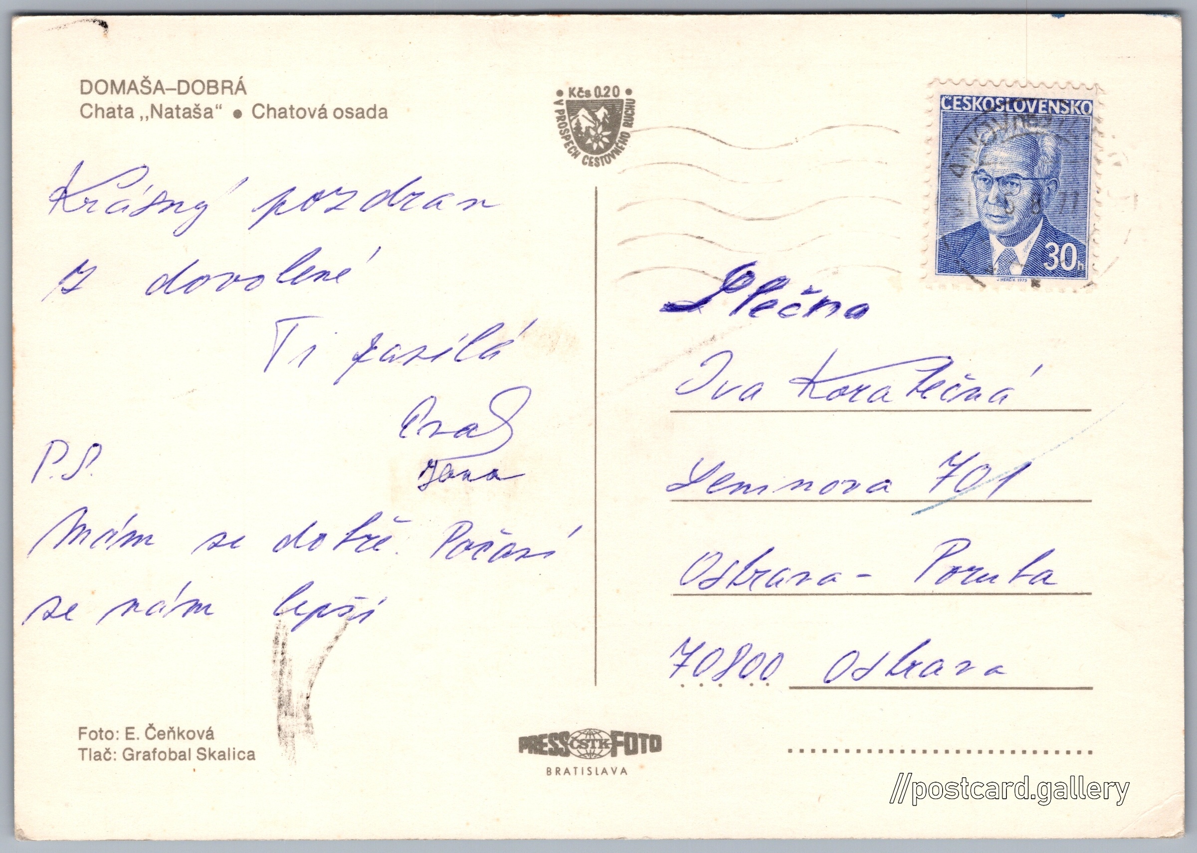 Domaša, Dobrá Pokud chcete vidět pohlednice ve vyšším rozlišení nebo zobrazovat jejich zadní stranu, tak se prosím nejdříve přihlašte Přihlásit Zaregistrovat Domaša Dobrá DOMAŠA-DOBRÁ- Chata "Nataša"- Chatová osada Jazyk tištěného textu na pohlednici: slovenština Chata - Domaša Dobrá, Vranovská cesta, Kvakovce, Slovensko ukázat na mapě V blízkém okolí místa zobrazeného na pohlednici lze najít 4 jiné pohlednice. Zobrazit blízké pohlednice Vydavatel: PressFoto Bratislava (Československo) Datum vydání není známo Pomozte nám odhadnout datum vzniku pohlednice Velikost (š x v) a tvar pohlednice: 149 x 105 mm (5.87" x 4.13"), obdélník Osoby spjaté s touto pohlednicí: Emilia Čeňková(Autor fotografie) Prošlá poštou Ceny: Příplatek na tur. ruch: 0,20 Kčs (CSK))Vyplacené známky: 0,30 Kčs (CSK) DiskuseVložit příspěvek Přidat novou složku ... Spravovat složky ...