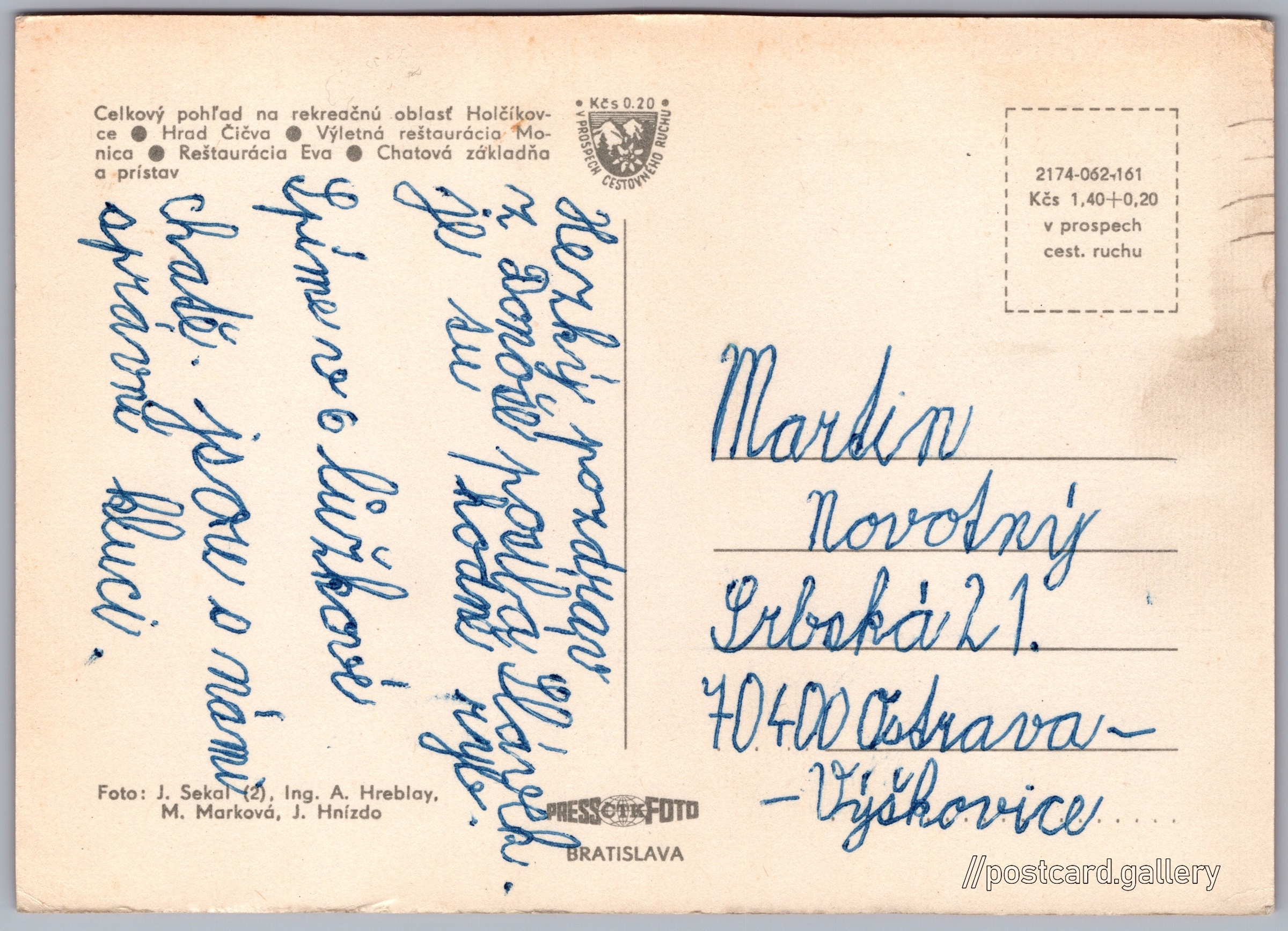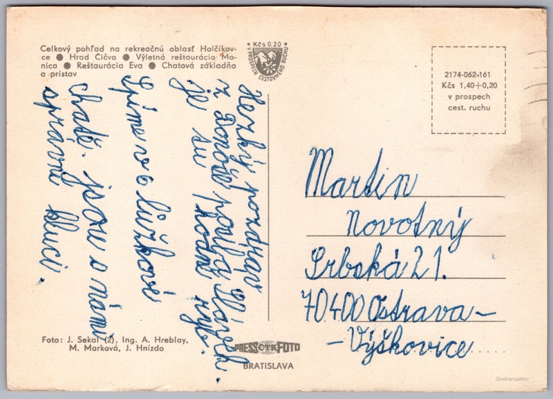 Domaša, Holčíkovce Pokud chcete vidět pohlednice ve vyšším rozlišení nebo zobrazovat jejich zadní stranu, tak se prosím nejdříve přihlašte Přihlásit Zaregistrovat - Celkový pohľad na rekreačnú oblasť Holčíkovce- Hrad Čičva- Výletná reštaurácia Monica- Reštaurácia Eva- Chatová základňa a prístav Jazyk tištěného textu na pohlednici: slovenština Domaša - Eva rekreačna chata, RO Domaša-Eva, Holčíkovce, Slovensko ukázat na mapě V blízkém okolí místa zobrazeného na pohlednici lze najít 3 jiné pohlednice. Zobrazit blízké pohlednice Vydavatel: PressFoto Bratislava (Československo) Datum vydání není známo Pomozte nám odhadnout datum vzniku pohlednice Velikost (š x v) a tvar pohlednice: 150 x 107 mm (5.91" x 4.21"), obdélník Osoby spjaté s touto pohlednicí: Josef Sekal(Autor fotografie) Margita Marková(Autor fotografie) J. K. Hnízdo(Autor fotografie) Ing. A. Hreblay(Autor fotografie) Prošlá poštou Ceny: Cena pohlednice: 1,40 Kčs (CSK) (+0,20 Kčs přípl. na tur. ruch) Kódy na pohlednici: 2174-062-161 DiskuseVložit příspěvek Přidat novou složku ... Spravovat složky ...
