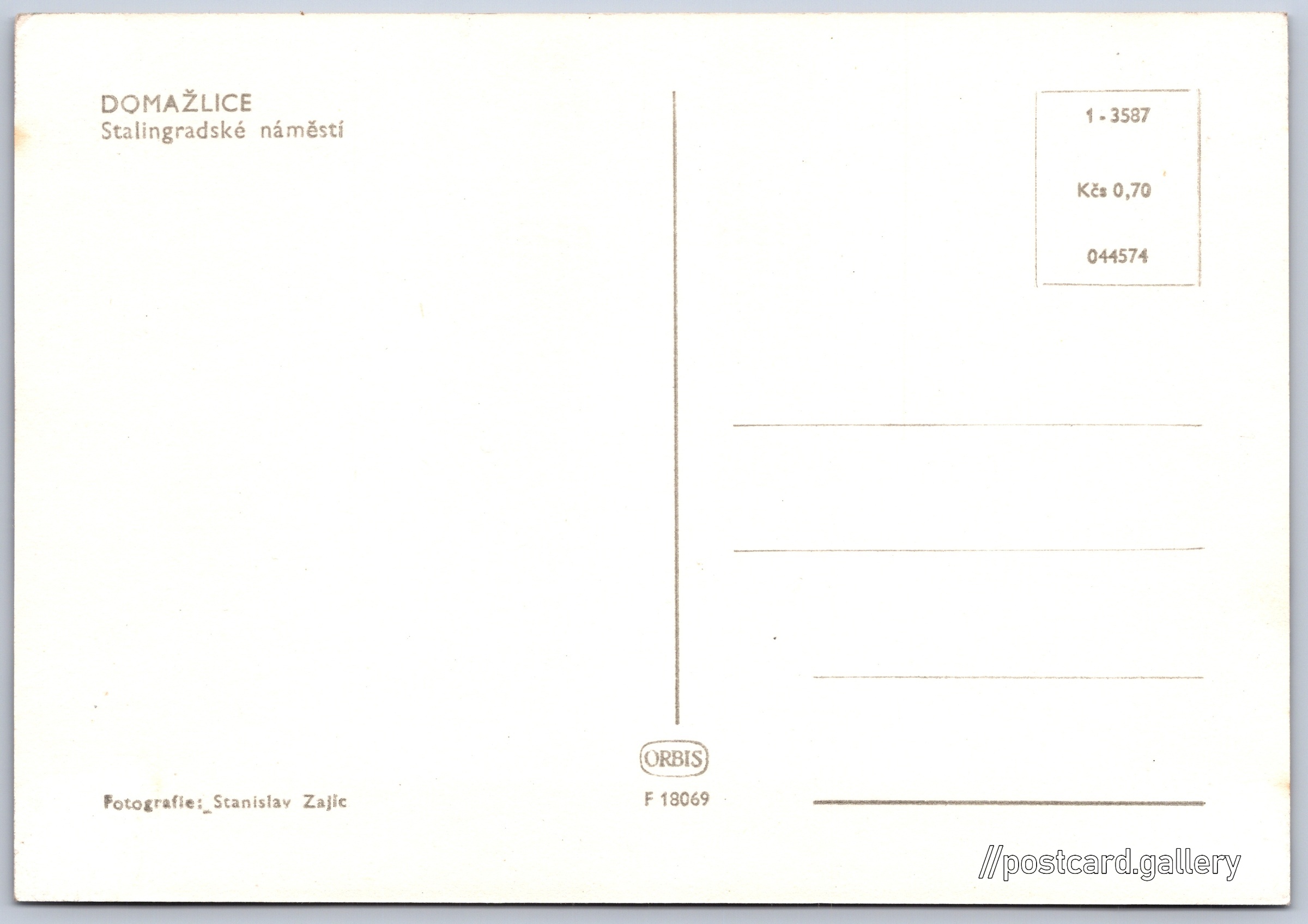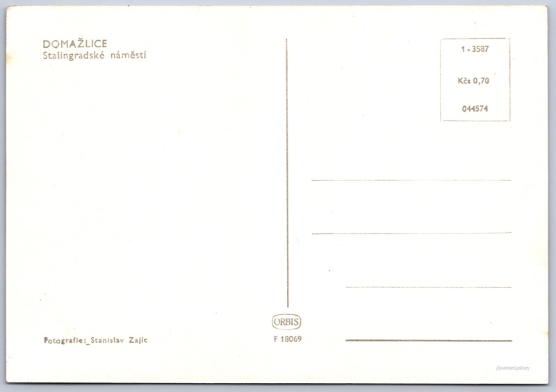 Domažlice, Stalingradské náměstí Pokud chcete vidět pohlednice ve vyšším rozlišení nebo zobrazovat jejich zadní stranu, tak se prosím nejdříve přihlašte Přihlásit Zaregistrovat DOMAŽLICEStalingradské náměstí Jazyk tištěného textu na pohlednici: čeština náměstí Míru 143, Domažlice, 344 01, Domažlice ukázat na mapě V blízkém okolí místa zobrazeného na pohlednici lze najít 2 jiné pohlednice. Zobrazit blízké pohlednice Vydavatel: Nakladatelství Orbis (Československo) Datum vydání není známo Pomozte nám odhadnout datum vzniku pohlednice Velikost (š x v) a tvar pohlednice: 147 x 102 mm (5.79" x 4.02"), obdélník Osoby spjaté s touto pohlednicí: Stanislav Zajic(Autor fotografie) Čistá pohlednice (neprošlá poštou) Ceny: Cena pohlednice: 0,70 Kčs (CSK) Kódy na pohlednici: F 18069 1-3587 044574 DiskuseVložit příspěvek Přidat novou složku ... Spravovat složky ...